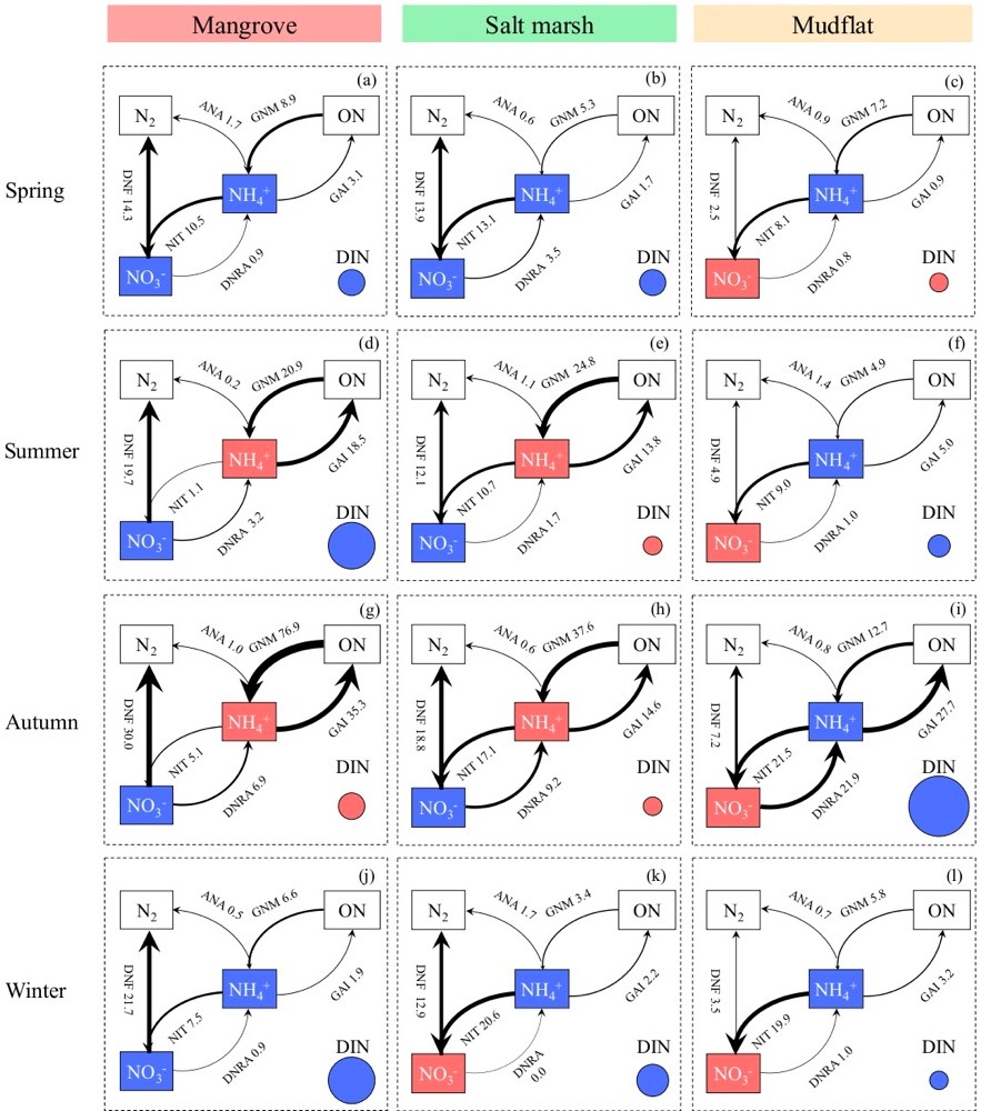图2. 2020年5月(春季)、7月(夏季)、11月(秋季)和2021年1月(冬季)红树林、盐沼和滩涂沉积物中NH4-N、NO3-N和DIN的净累积(红色)和净去除(蓝色)。黑色箭头的粗细及数字的大小代表矿化(GNM)、同化(GAI)、硝化(NIT)、反硝化(DNF)、厌氧氨氧化(ANA)和异化还原(DNRA)速率的相对大小