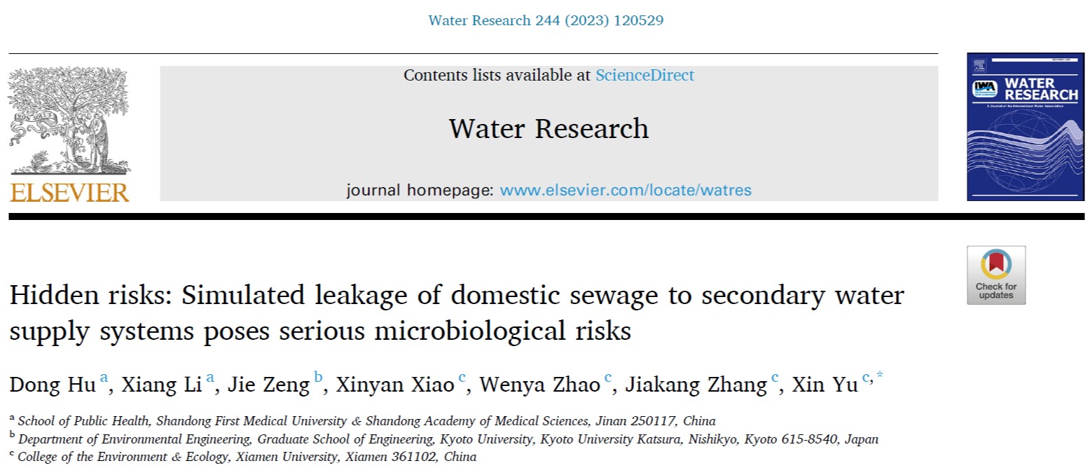 近日,我院水质安全团队于鑫教授课题组在环境领域高水平期刊Water Research上发表了题为“Hidden risks: Simulated leakage of domestic sewage to secondary water supply systems poses serious microbiological risks”的研究论文。本研究系统性的探讨了二次供水系统遭遇不同水平的生活污水污染后贮水箱内水质的变化及可能产生的微生物学风险,这一工作对二次供水系统的水质安全保障具有重要的参考价值。