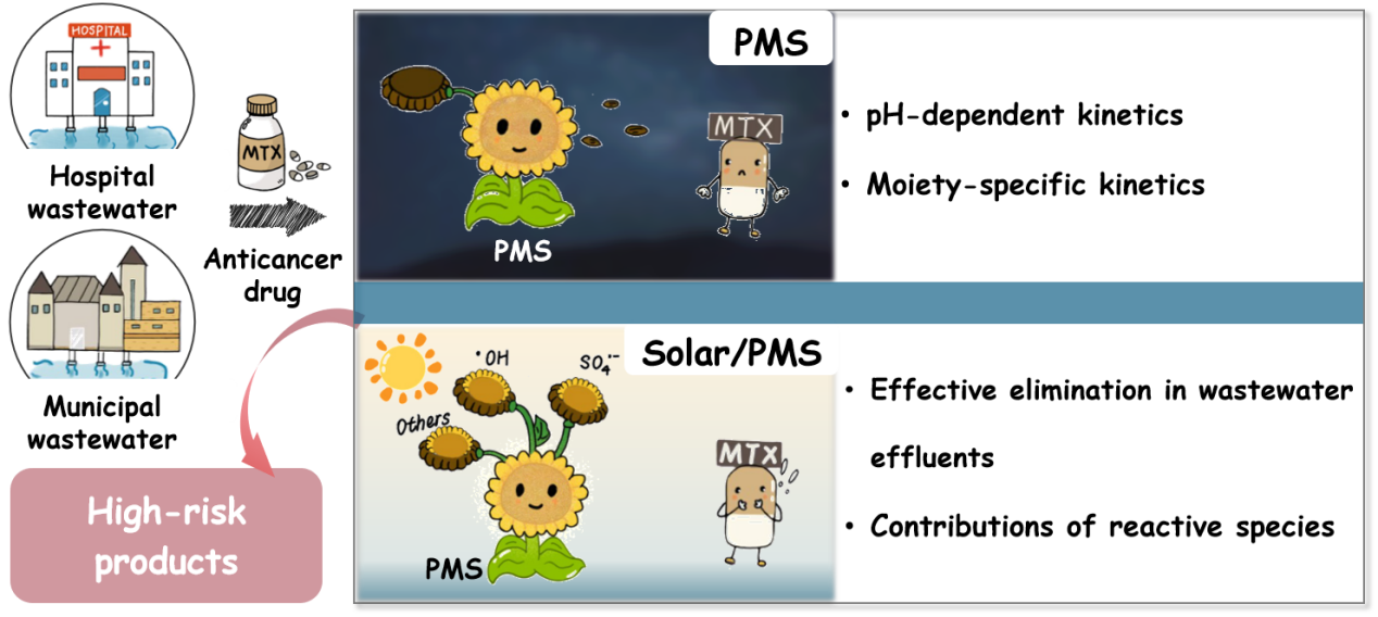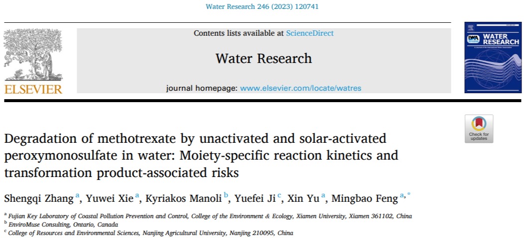 近日,我院水处理技术与水质安全团队冯明宝课题组在环境领域高水平期刊 Water Research 上发表了题为“Degradation of methotrexate by unactivated and solar-activated peroxymonosulfate in water: Moiety-specific reaction kinetics and transformation product-associated risks”的论文。该论文研究了水中PMS直接氧化MTX及其模式分子的反应动力学,以及典型共存组分(如卤素离子、天然有机质和实际废水基质)的影响;探究了太阳光/PMS体系中多种活性自由基对MTX及其模式分子的化学反应性和氧化贡献;识别了PMS和太阳光/PMS体系中MTX的转化产物,并研究其降解机制;利用在线软件预测评估了MTX转化产物的毒性效应。该工作对于揭示MTX在PMS和多活性自由基氧化过程的反应动力学、典型共存组分影响,及基于PMS的水处理工艺中的降解机制具有重要意义。