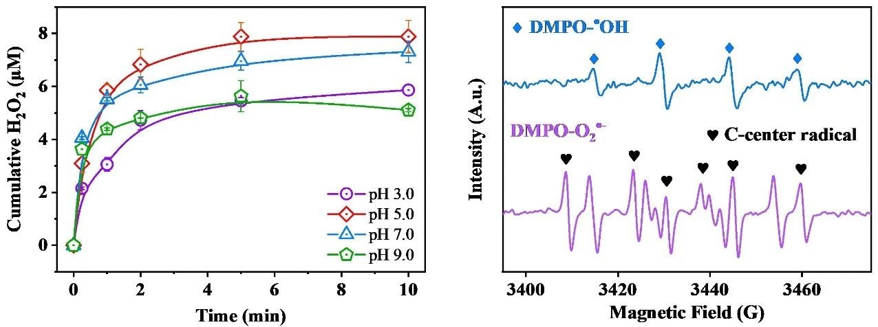 (1)左图中检测出原位产生的双氧水以及EPR图谱羟基自由基的特征峰显示Fe2+/EDTA体系(O2气氛),Fe2+-EDTA络合物活化O2,通过两电子氧还原反应原位产生H2O2 快速生成•OH。