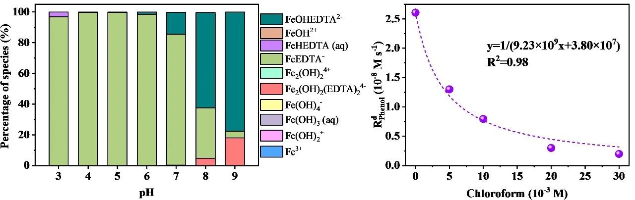 综上,这项研究一定程度上改善了传统芬顿反应作为常用水处理技术的应用限制,提出可通过改变亚铁/三价铁离子对水中的存在形态来调整传统芬顿链式反应的氧活性物种输出途径。未来也可在改变配体的结构,金属离子/络合物相投加比例等角度进一步探索,尝试选择性的处理复杂水体中有害组分。