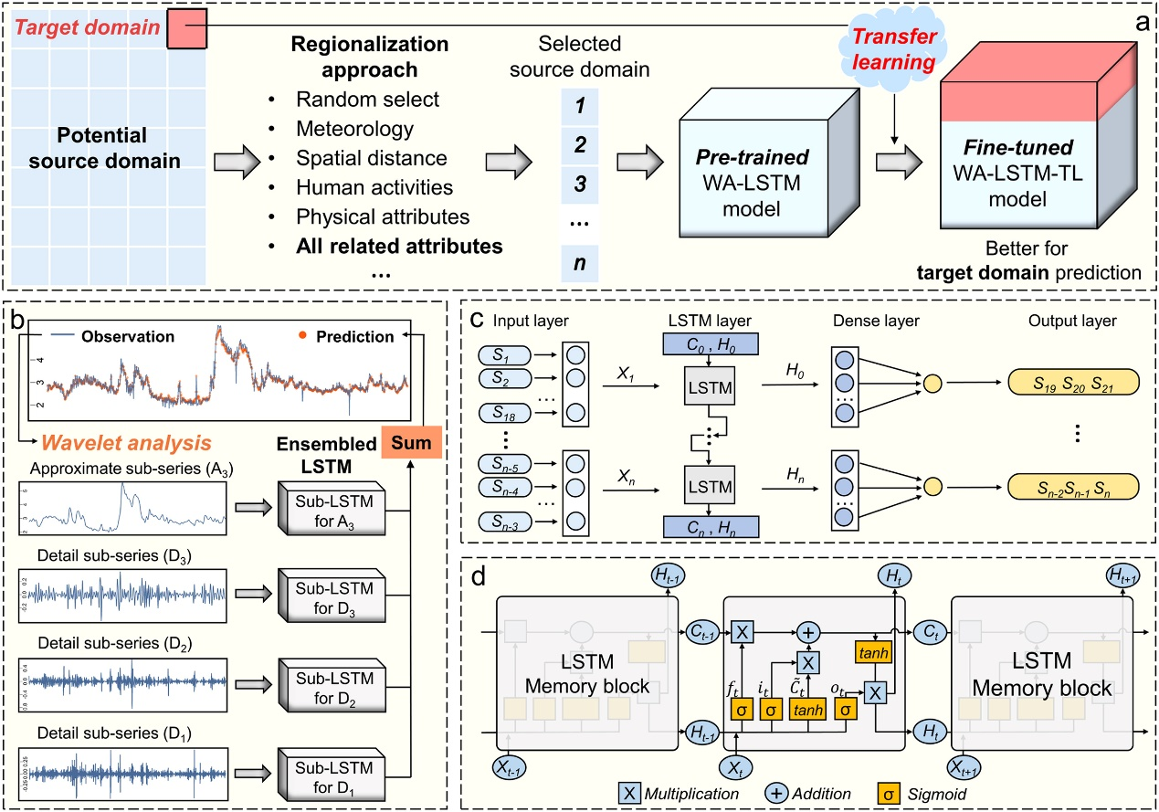 研究将两种先进技术(即:小波分析WA 和迁移学习TL)与 LSTM 耦合,构建 WA-LSTM-TL模型,以同时解决河流水质预测中的非稳态和数据受限两大难题。我们展示了如何将预训练的 WA-LSTM 耦合模型通过TL 技术转移到其他地区,并利用当地较少的监测数据对其进行优化,从而实现高频精确预测。我们旨在解决两个主要研究问题:(1) WA 和 TL 技术能否帮助 LSTM 显著提高预测性能? (2) 如何以及何时使用 WA 和 TL 技术来克服水质动态的高度非稳态和监测数据受限问题?