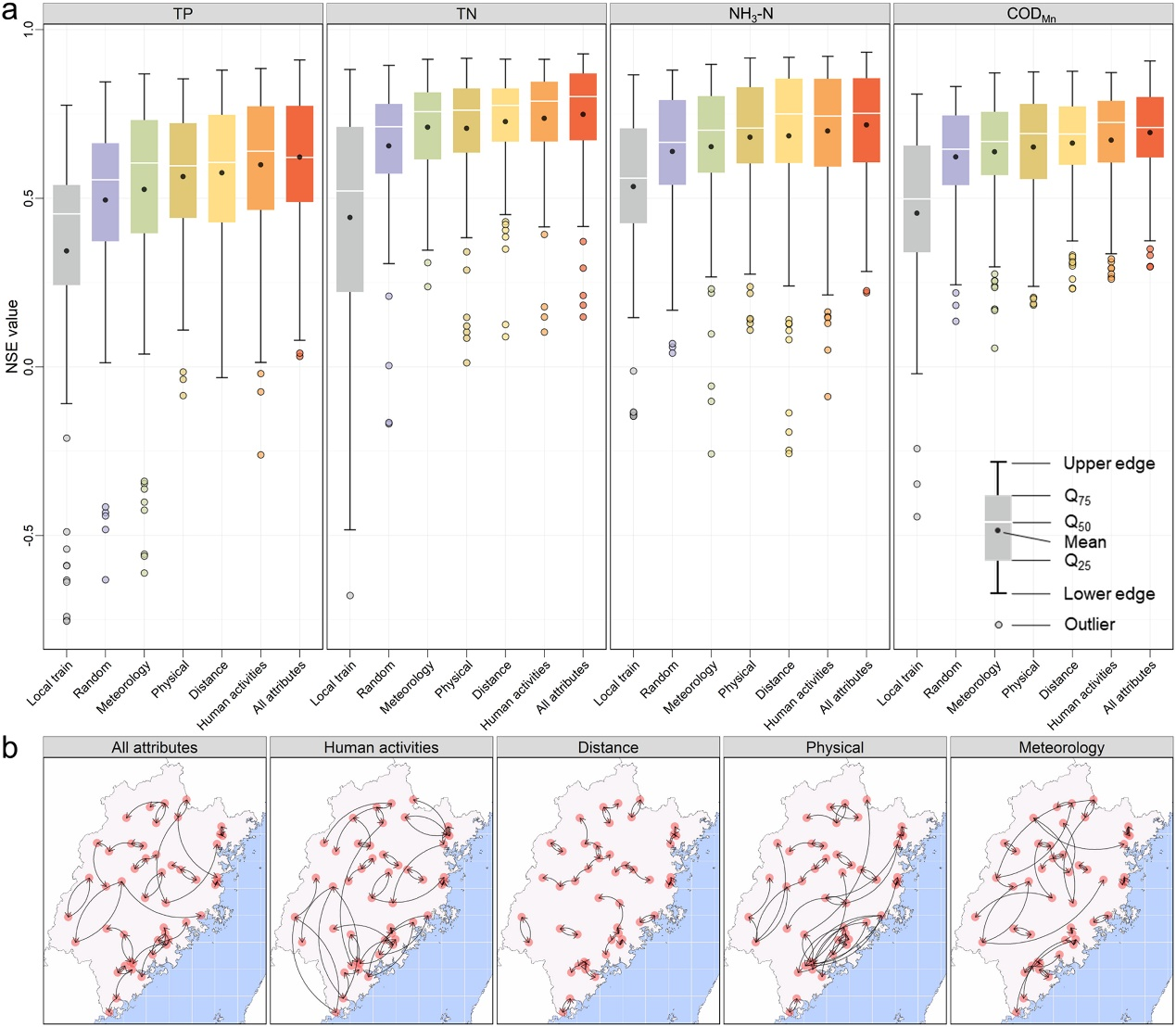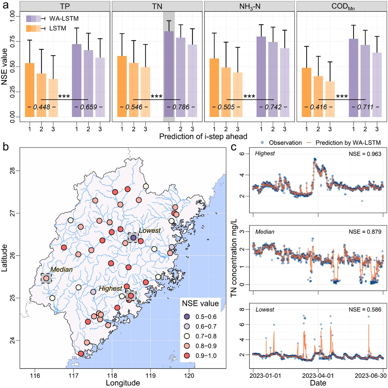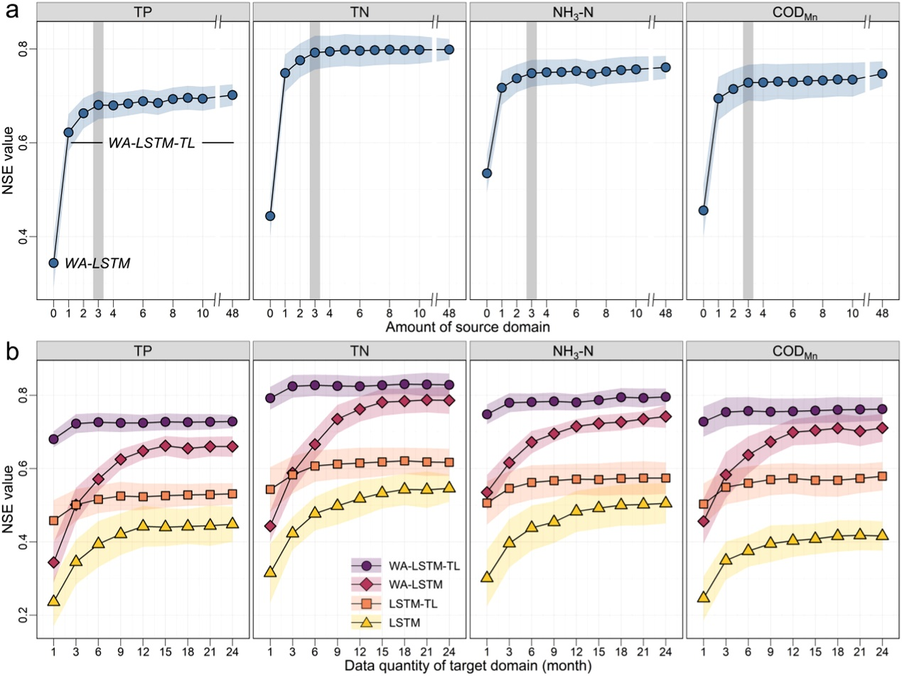 在中国福建省 49 个水质监测点中,以 4 小时为时间步长对总磷、总氮、氨氮和高锰酸盐指数进行了预测。使用涵盖 20 个指标的区域化方法为每个目标域(待预测点)选择了合适的源域(数据提供点),以提高 WA-LSTM-TL 的预测效率。耦合的WA-LSTM有助于捕捉水质动态的非稳态模式,与传统LSTM相比,测试期性能显著提升(+53%)。在源域丰富数据的帮助下,WA-LSTM-TL的性能比本地训练的 WA-LSTM 高17%,且在本地数据有限的情况下,性能提升更显著(+66%)。基于迁移学习的建模优势随数据量的增加而减弱;但无论目标域数据是有限还是充足,其表现都优于本地直接建模。研究证明了将 WA 和 TL 技术与 LSTM 模型耦合的合理性,并从非稳态和数据受限的角度为改善河流水质的短期预测提供了前景广阔的耦合建模方法。基于该方法,有望在未来实现大洲甚至全球尺度的协同精确预测。