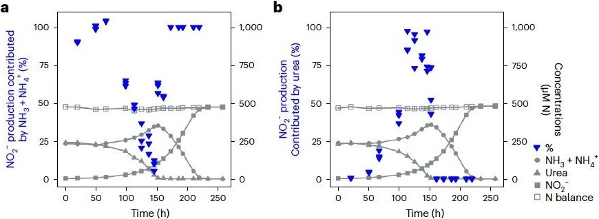 为进一步评估在尿素存在时对游离态氨的使用情况,并探究替代氮源的转化过程,本研究选择以释放大量游离态氨的N. lacus作为研究对象。通过采用15N稳定同位素示踪方法,追踪了N. lacus在批式培养过程中对氨和尿素的利用情况。根据随时间推移胞外15N同位素的积累情况,将其分为三个不同阶段(图2)。在加入15NH3和14N-尿素的培养组中,发现在延滞期(0–50小时)阶段,少量15NO2-的产生主要来源于15NH3,这可能是由于接种液是来自以氨作为底物的培养基进行的预培养。然而,当N. lacus生长进入指数期(到100–150小时),本研究发现在整个指数生长过程中,最初产生的少量15NO2-被源自尿素产生的未标记NO2-迅速稀释。换句话说,15NH3对15NO2-产量的贡献急剧下降(图2a)。相反,在加入15N-尿素和14NH3的培养组中,结果表明:在指数生长过程中,NO2-的积累几乎完全源自尿素(图2b)。进入第三阶段,即当尿素耗尽后(~150小时),氨消耗迅速恢复,且直到停止生长,所有NO2-的积累都来自氨(图2a)。