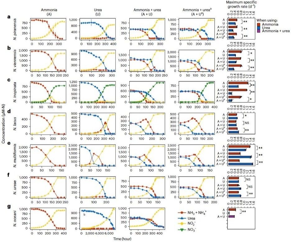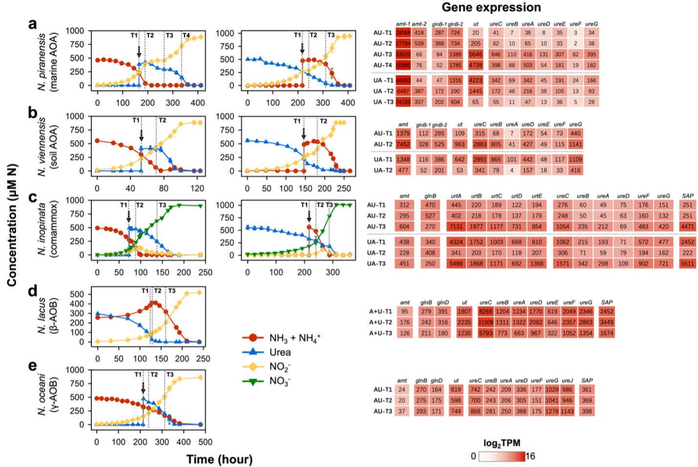 基于之前的分析,研究团队已经明确了解到β-AOB中的N. lacus在摄取尿素时会释放大量游离态的氨。据此,研究团队同时添加了等量的氨氮和尿素氮,并在N. lacus利用尿素及尿素耗尽后转而利用氨氮的各个阶段,分别收集细胞进行转录组分析。研究发现无论在细胞利用氨氮还是尿素氮阶段,所有参与尿素吸收和水解的相关基因都表现出相对较高的转录水平(图5d)。这表明这些基因在N. lacus中是组成型表达,在其生长过程中,细胞会分配大量资源以促进对尿素的优先利用。