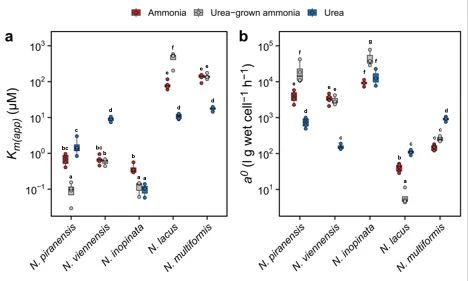 值得注意的是,β-AOB中的N. lacus和N. multiformis对尿素的亲和力比对氨高出了2.7–6.2倍。相比于土壤AOA对尿素的亲和力,它们具有相当或者甚至更高的亲和力,这也意味着在土壤和淡水沉积物环境中,一些常见的AOB可能会有效地与AOA竞争尿素。