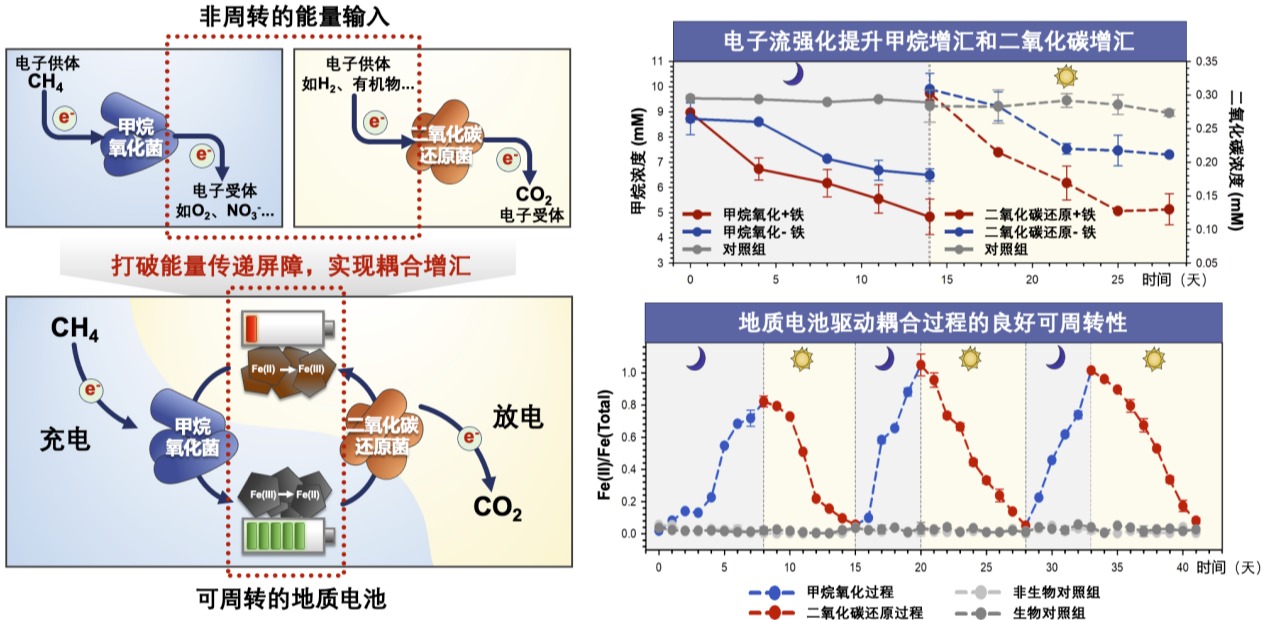 该工作基于微生物电子流研究,利用铁矿物作为电子中介体,打破了甲烷氧化菌群和二氧化碳还原菌群的电子传递屏障。通过矿物中铁价态的氧化还原转换,原位构建了“微生物地质电池”,基于充电过程(三价铁→二价铁)驱动甲烷氧化过程,基于放电过程(二价铁→三价铁)驱动二氧化碳还原过程。铁矿物耦合甲烷氧化过程和二氧化碳还原过程,可提升82.8%的甲烷消耗和79.5%的二氧化碳消耗,16.7%的温室气体碳被固定到生物质,温室效应增温潜能减少47.2%。基于光暗的条件转换,铁矿物的地质电池表现出良好的充放电的可周转性,在黑暗条件下铁矿物被氧化后可以被完全还原为二价铁矿物,随后光照条件下二价铁矿物再次被充分氧化为三价铁矿物。铁矿物良好的周期性可以减少甲烷氧化过程中外源电子受体的输入和二氧化碳还原过程中外源电子供体的输入,构建形成一个可周转的自循环温室气体减排体系。