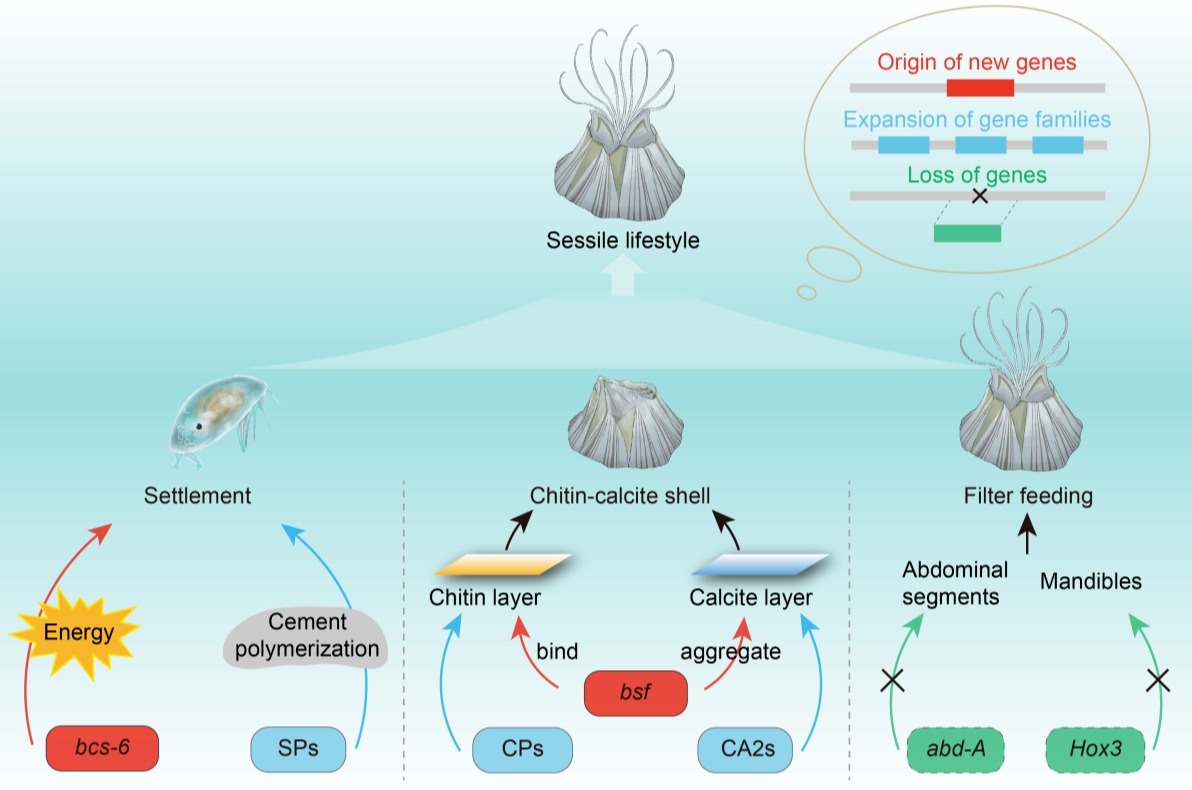 4月23日,我院张原野副教授团队与海洋与地球学院柯才焕、冯丹青教授团队合作在海洋生物基因组学和污损生物附着研究领域取得最新进展,相关成果以“New genes helped acorn barnacles adapt to a sessile lifestyle”为题发表于国际顶尖期刊 Nature Genetics. 该研究分析了代表性海洋污损生物藤壶附着和壳形成过程,通过探究新基因bcs-6和bsf的起源和功能,揭示了新基因为生物适应独特生境提供关键遗传基础,为海洋防污损技术和仿生材料研发提供重要见解。Nature Genetics 同期还刊发了作者团队受邀撰写的题为“New genes are involved in the adaptation of acorn barnacles to sessile life”的研究简报,对该成果进行科普性介绍。