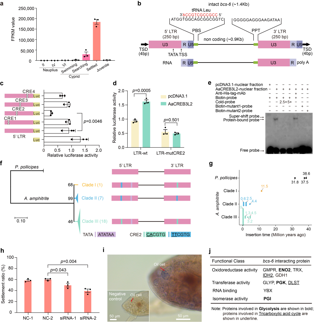 该研究获得了染色体水平的纹藤壶(Amphibalanus amphitrite)基因组。在26个扩张基因家族中,3个与附着有关,9个与壳形成有关。Hox基因家族成员Hox3和abd-A在藤壶基因组中丢失,这可能与其为适应底栖固着生活而导致的捕食和游泳器官的衰退有关。该研究偶然发现藤壶附着过程中的一个超高表达基因具有完整的转座子结构(bcs-6,图2)。bcs-6属于微型末端重复反转录转座子(TRIM),纹藤壶bcs-6基因高表达的原因是其在进化过程中获得了TATA盒和顺式调控元件CRE2(CACGTG),并且在基因组中发生了多次转座导致基因加倍。bcs-6基因在纹藤壶金星幼体的油滴细胞中表达,与三羧酸循环和糖酵解相关的蛋白结合,调控了附着过程中的内源能量供应。利用RNAi干扰bcs-6基因后,金星幼体附着率显著降低,验证了bcs-6在附着中起到重要作用。该研究表明,转座子不仅为基因或基因调控系统贡献片段,还可以通过获得启动子和顺式调控元件整体转化为新基因并产生功能,这更新了对转座子的认识。