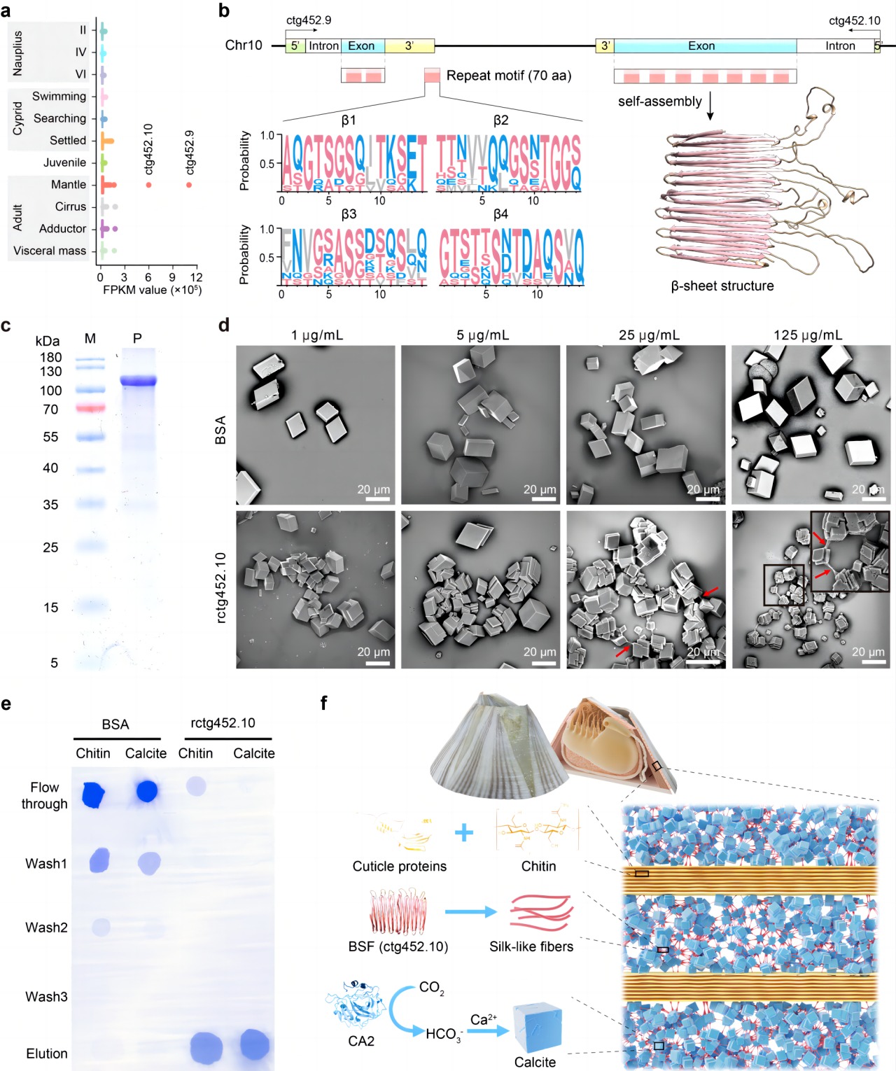 另外,该研究还发现一个在纹藤壶壳形成关键组织外套膜中超高表达的新基因(bsf,图3),其编码的蛋白包含7个重复基序,每个重复基序可形成4个反向平行的β折叠结构。其重组蛋白可在水环境中自组装形成丝状纤维,与几丁质和方解石紧密结合。该研究提出了藤壶壳形成的机制模型,即表皮蛋白通过结合几丁质形成几丁质层,碳酸酐酶通过催化形成HCO3-进而结合Ca2+形成方解石层,蛋白BSF促进方解石的凝聚矿化并黏合几丁质层,形成稳固的方解石-几丁质依次排列的层状结构。探究适应特定环境进化的bsf基因特征,有助于开发水环境中具有特殊黏合作用的仿生材料。