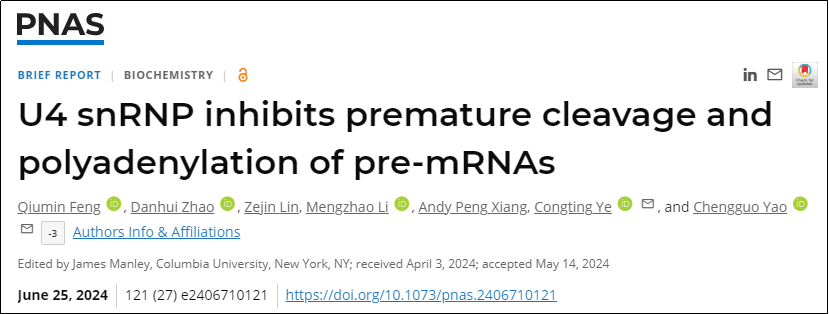 6. Feng Q, Zhao D, Lin Z, Li M, Xiang AP, Ye C, Yao C. U4 snRNP inhibits premature cleavage and polyadenylation of pre-mRNAs. Proc Natl Acad Sci U S A. 2024 Jul 2;121(27):e2406710121.
