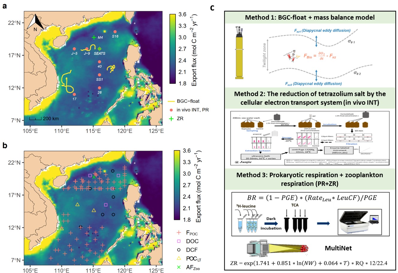 本研究基于学科交叉、多手段耦合的思路,在海盆尺度上综合运用船基培养实验、自动化观测设备、同位素示踪、遥感反演和历史数据集成等多样化手段,通过交叉比较和集成分析,精确量化了南海弱光层有机物再矿化速率,揭示多种有机碳输入对平衡弱光层碳收支的关键作用。为理解低纬度边缘海弱光层的生物泵运作机制、生态过程以及碳循环提供了重要参考。