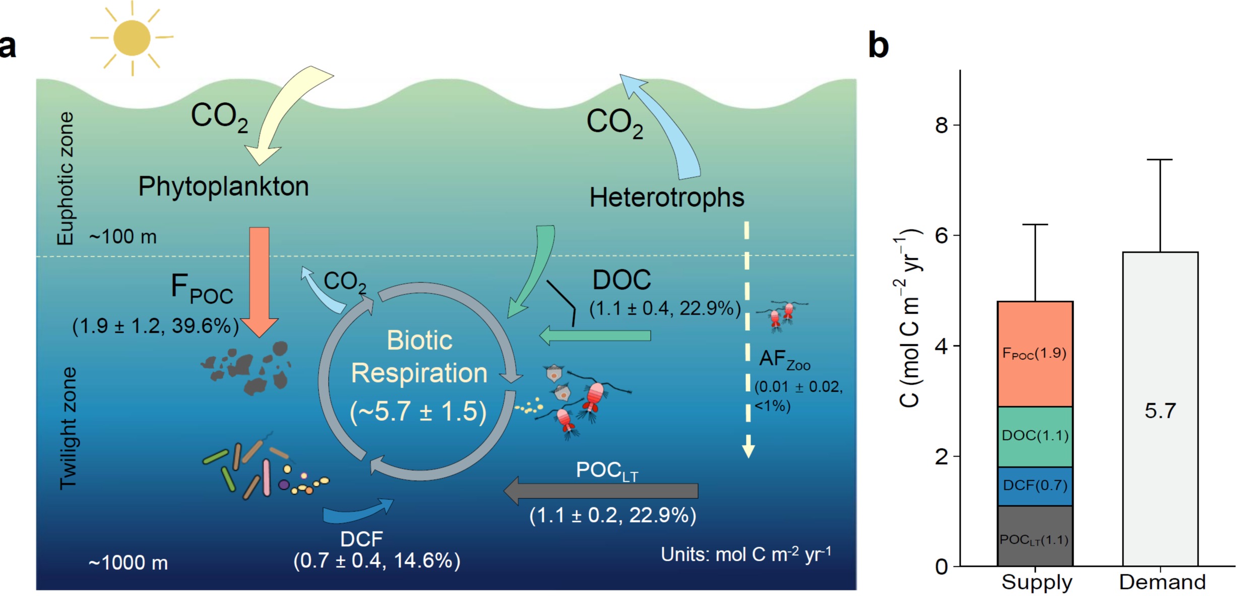 海洋生物泵是海洋固碳和储碳的关键机制,对维持海洋碳汇功能和调控全球气候至关重要。弱光层,通常定义为真光层底部至1000m之间的区域,是有机物从表层向深层转移的“中转站”,约有超过70% 从上层输出的颗粒有机碳在该区域被再矿化分解。因此,精确量化弱光层内有机物的再矿化速率对评估海洋生物泵效率以及理解碳循环十分重要。然而,当前学界对于弱光层再矿化过程以及维持该过程的有机碳来源的认知还十分有限。一方面,基于不同研究方法估算得到的弱光层矿化速率存在显著差异;另一方面,以弱光层有机物再矿化速率表征的深层碳需求难以与目前已知的上层碳供应相平衡。目前尚无法确定这种不平衡是源于碳需求定量的偏差,还是由于对碳供应考虑不够全面所致。这些不确定性严重阻碍了我们对弱光层生物泵过程的全面理解。