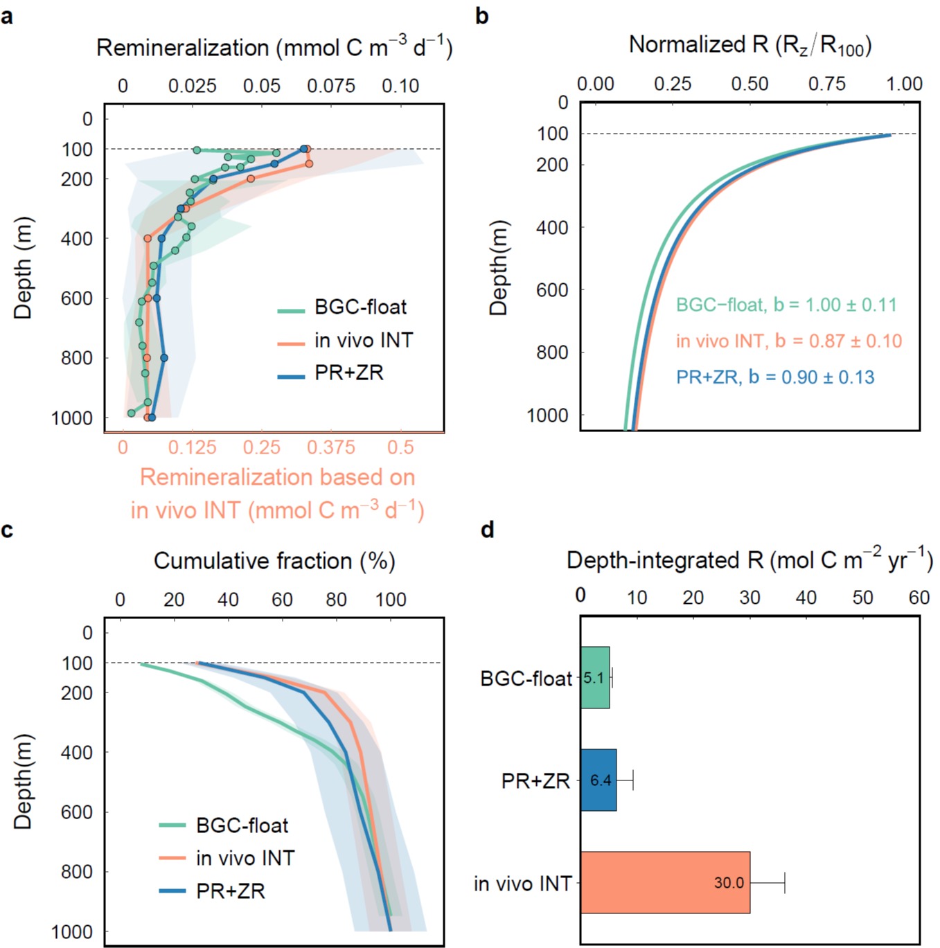 为了更加精准地量化弱光层再矿化速率以及深海碳收支平衡,研究团队选取西太平洋最大的边缘海—南海作为研究区域。在技术手段上,引入三种独立的观测方法对南海弱光层再矿化速率开展对比/集成分析,包括 (1) 生物地球化学剖面浮标 (BGC-Argo) 携带的溶解氧传感器的高频观测;(2) 细胞电子系统传递培养实验 (in vivo INT);(3) 基于同位素示踪的原核生物呼吸和基于生物量的估算的浮游动物呼吸的综合检测 (PR+ZR) (图1)。研究发现,基于三种不同方法观测得到的弱光层再矿化速率都随深度呈显著的指数衰减,约80%的再矿化发生在400m以浅。弱光层再矿化速率的水柱积分显示,BGC-Argo和PR+ZR估算的结果较为一致,分别为5.1±0.5和6.4±3.0mol C m-2 yr-1 ,相比之下,in vivo INT 方法估算弱光层再矿化速率为30.0±6.1mol C m-2 yr-1,比其余两种方法高接近一个数量级 (图2)。