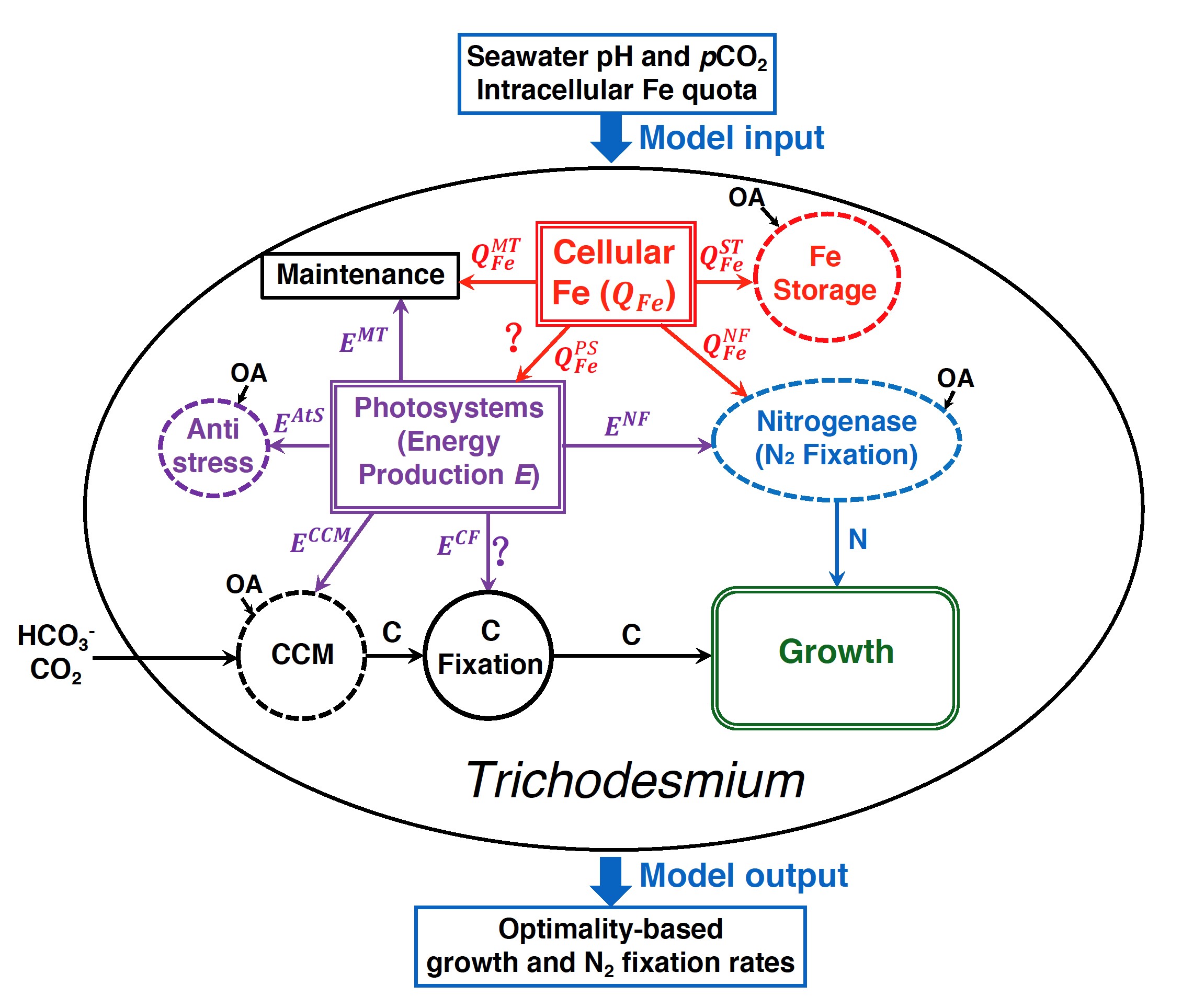 近期,史大林研究团队与海洋与地球学院副教授罗亚威博士紧密合作,在上述研究工作的基础上,进一步系统地测定了固氮和光合系统蛋白的表达量及其含铁量,建立了一个束毛藻的“资源最优化分配”细胞模型(图1)。该模型模拟束毛藻胞内铁和能量如何在无机碳吸收、光合作用、固氮作用、生命维持、对抗酸化协迫、铁储藏等各主要生理过程之间的最优化分配,以最大化其生长速率;并且模拟了海洋酸化对几个主要生理过程的调控,包括CO2浓缩机制(CCM)耗能的减少、固氮酶效率的下降、抗酸化胁迫耗能的上升、以及铁储藏的减少。以胞内铁水平以及海水pH和CO2浓度为输入变量,该模型即可求解胞内铁和能量的最优化分配以及对应的最大化生长和固氮速率。