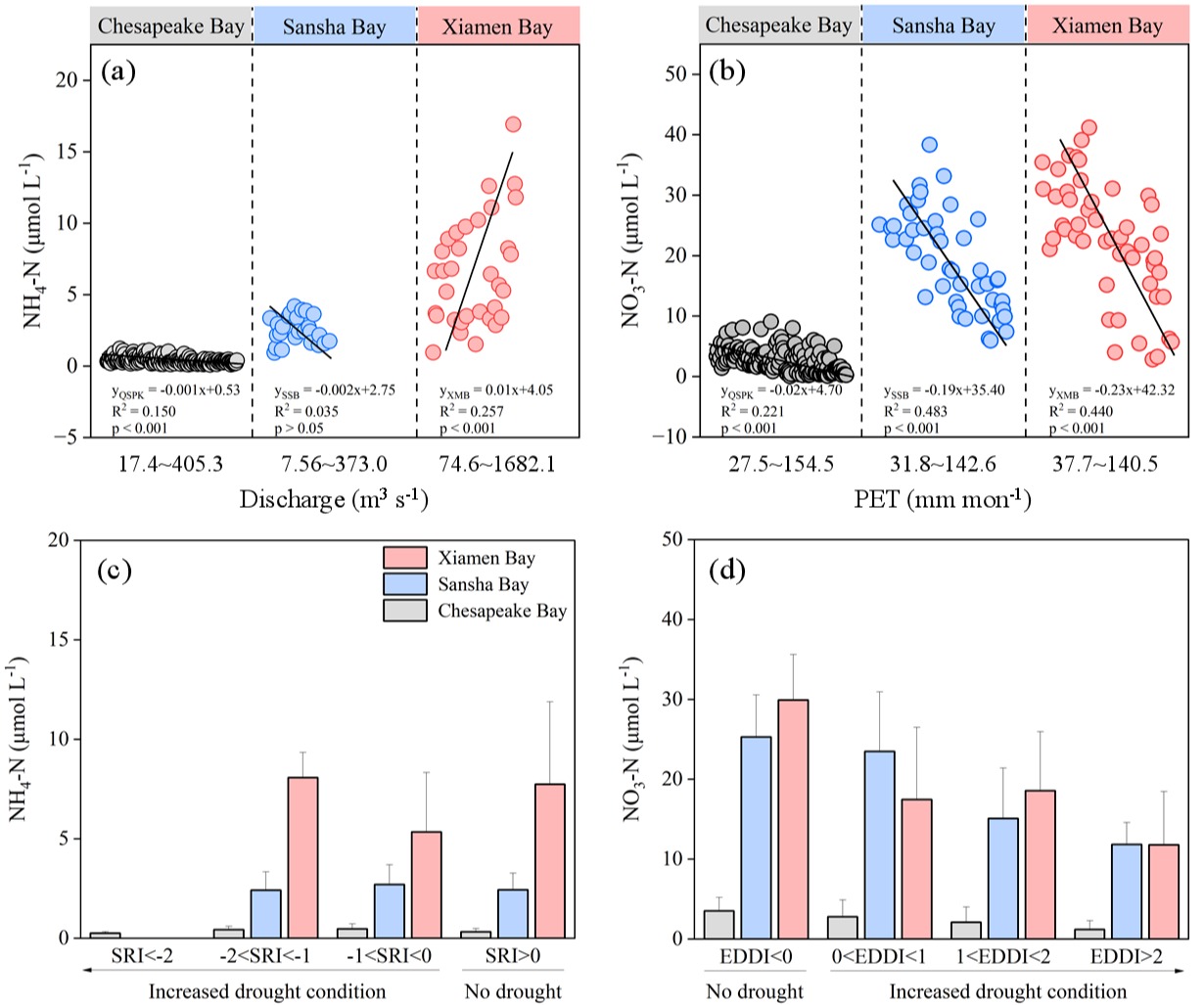 (4)通过与福建省三沙湾和美国切萨皮克湾的对比分析,发现三个海湾的潜在蒸散发与硝氮浓度之间存在一致的负相关关系,特别在蒸发需求干旱指数(EDDI)较大时相关性更为显著(图5)。值得注意的是,厦门湾中氨氮与河流径流呈正相关,但在其他两个海湾中则呈负相关。这些结果反映了不同海湾两种氮源供应机制的区域差异以及复杂性。