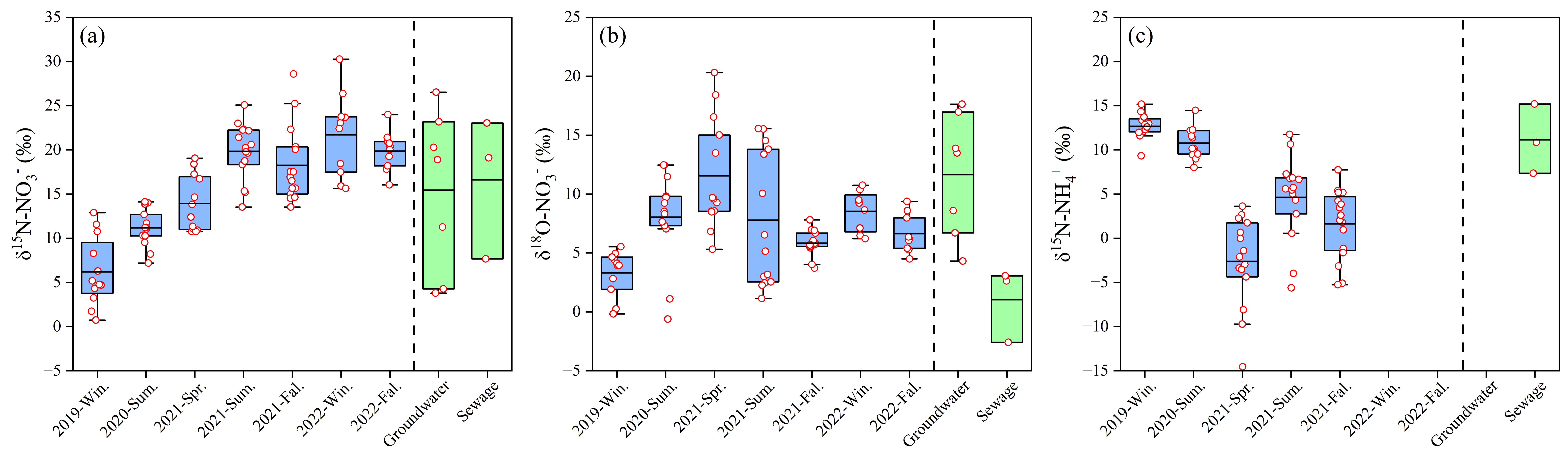 图4 厦门湾海水中硝氮氮氧同位素和氨氮氮同位素以及干旱期间地下水和污水的同位素值对比。