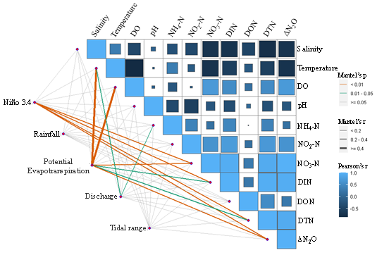 图3 厦门湾水文气象参数与水质指标的Mantel相关性分析