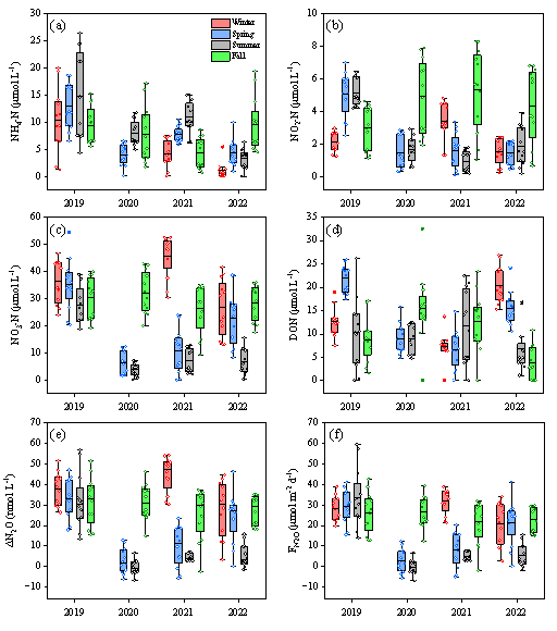 图2 厦门湾表层海水氮浓度(a-d)、ΔN2O浓度(e)和海气界面N2O通量(f)的季节变化与年际变化