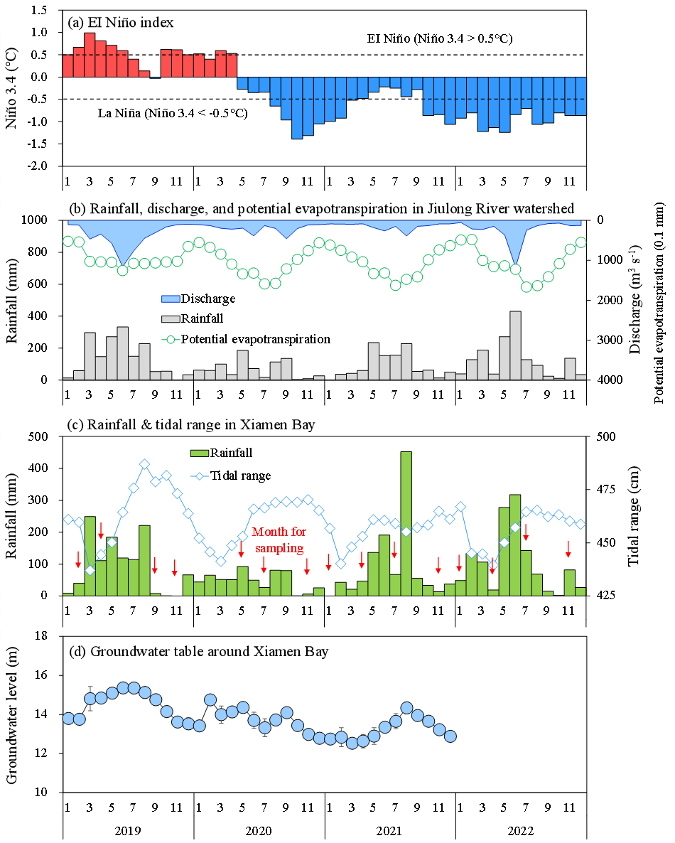 气候变化在加速厄尔尼诺/南方涛动(ENSO)的相态转换,这可能增加洪水、干旱等极端天气事件发生的频率和强度。近期研究表明,随着全球气温上升,突发性干旱事件或将成为新的常态。这些变化将重塑陆地水文格局,并对营养物质循环和近海生态系统产生深远影响。此外,海岸带地区人为氮源过量输入,也在加速近海水体富营养化。近海氮循环及其相关的温室气体排放对气候变化的响应是当前生物地球化学研究的焦点内容之一。然而,干旱事件如何影响氮素的陆海输运模式,以及氮源供应的变化如何进一步影响海湾水体氮循环和温室气体N2O的排放,仍缺乏观测数据和系统性研究。