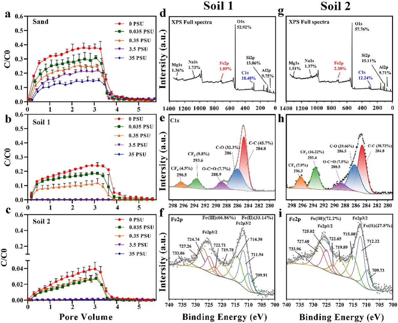 图2 微塑料在多孔介质中的穿透曲线(a-c)及两种原始土壤的表面化学性质分析(d-i)