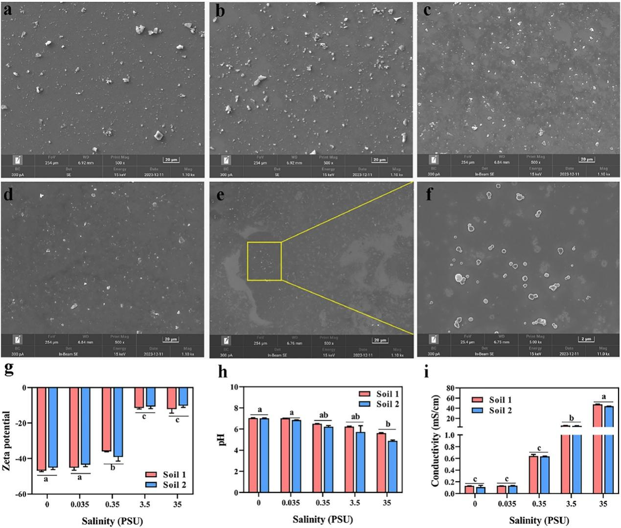 盐度递变是滨海河口湿地的典型特征,显著影响土壤孔隙水的物理化学性质。盐度的增加导致了湿地土壤孔隙结构的显著变化,表现为平均孔径的减小和结构的收缩(图4-5),盐度也改变了土壤电位,影响了土壤孔隙的连通性,抑制了MPs的纵向迁移能力。盐度在影响MPs垂直迁移中起着关键作用,高盐度限制MPs的迁移,增加了环境污染风险。这为理解滨海湿地尤其河口区盐度变化梯度下MPs的迁移行为提供了新视角。