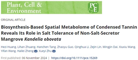 Hezi Huang, Lihan Zhuang, Hanchen Tang, Zhaoyu Guo, Qinghua Li, Zejin Lin, Mingjin Dai, Xiuxiu Wang, Yifan Wang, Hailei Zheng*, Xueyi Zhu*. Biosynthesis-based spatial metabolome of condensed tannin reveals its role in salt tolerance of non-salt-secretor mangrove Kandelia obovata. Plant, Cell & Environment. 1-16, 2024.