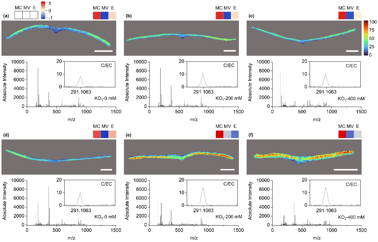 图4 不同浓度NaCl处理下秋茄叶片中CT合成单体(儿茶素/表儿茶素)的空间代谢组成像及相对丰度