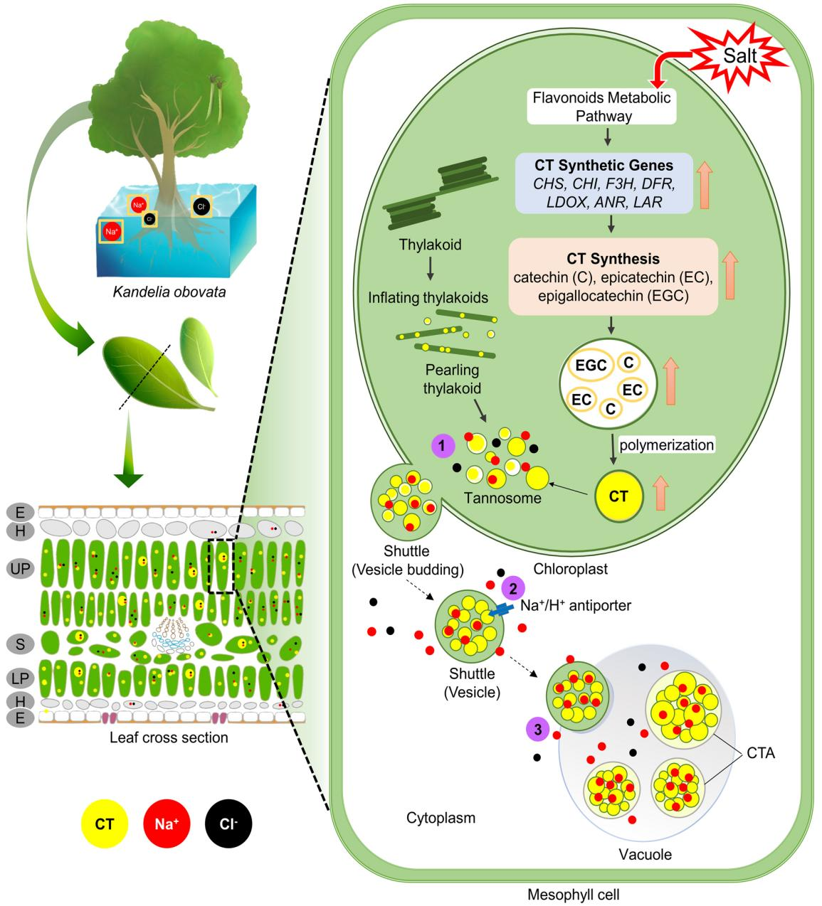 研究结果表明:非泌盐红树植物秋茄CT生物合成与叶片中Na+的积累呈正相关。盐处理促使秋茄叶片中CT合成相关基因表达上调,增加叶肉细胞中CT合成相关类黄酮代谢物的合成,特别是CT单体,进而增加叶肉细胞中缩合单宁的合成及其聚集体CTA在液泡中的积累。叶绿体中合成的CT以穿梭体囊泡经由细胞质被运输至液泡,在此过程中CT结合过量Na+,并将之运输到液泡中区室化隔离,从而使非泌盐红树植物秋茄具有更高的耐盐性(图5)。