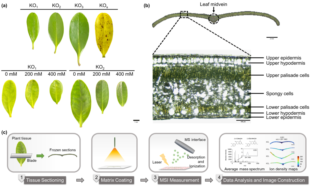 近日,厦门大学环境与生态学院朱学艺教授和郑海雷教授团队揭示了非泌盐红树植物秋茄叶片中CT生物合成与其Na的积累呈正相关,秋茄通过在肉质化的叶肉细胞中特异性积累缩合单宁聚集体(condensed tannin accretion, CTA),将Na+区隔化到液泡中来增强植物的耐盐性, 这为非泌盐红树植物的耐盐机制提供了新的见解。相关成果以 “Biosynthesis-based spatial metabolome of condensed tannin reveals its role in salt tolerance of non-salt-secretor mangrove Kandelia obovata” 为题发表在Plant, Cell & Environment.