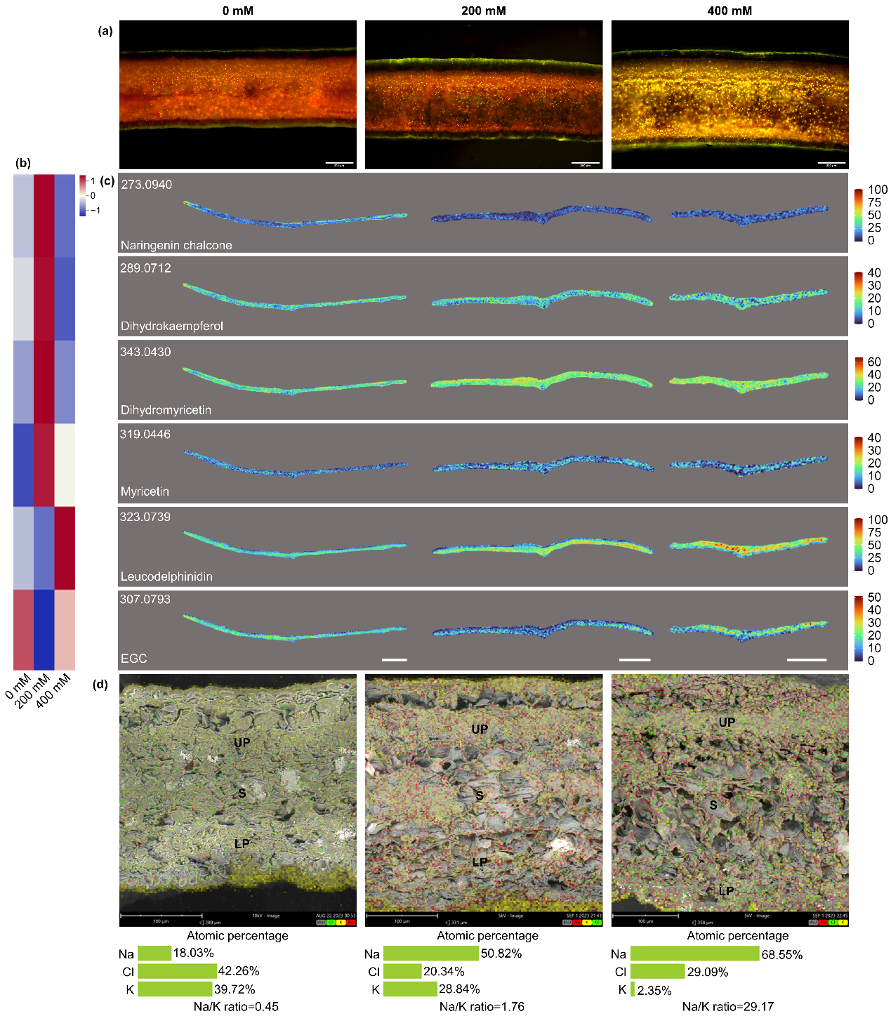 对参与CT生物合成的黄酮类代谢物的空间代谢组学分析表明(图3,图4),与CT合成相关的类黄酮化合物和三种CT单体主要集中在叶肉细胞区域,这与扫描电镜能谱显示叶肉细胞中Na和Cl主要分布在叶肉细胞的结果相一致。实时荧光定量PCR验证确认,编码CT生物合成酶的基因相应上调。