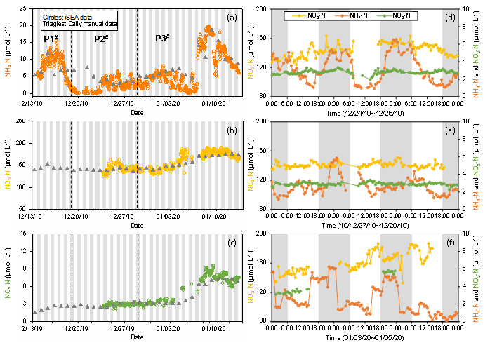 图1 江东水库溶解性无机氮浓度变化(a:NH4-N,b:NO3-N,c:NO2-N)和某些时间段放大子图(d:2019年12月24日至26日;e:2019年12月27日至29日;f:2020年1月3日至5日)