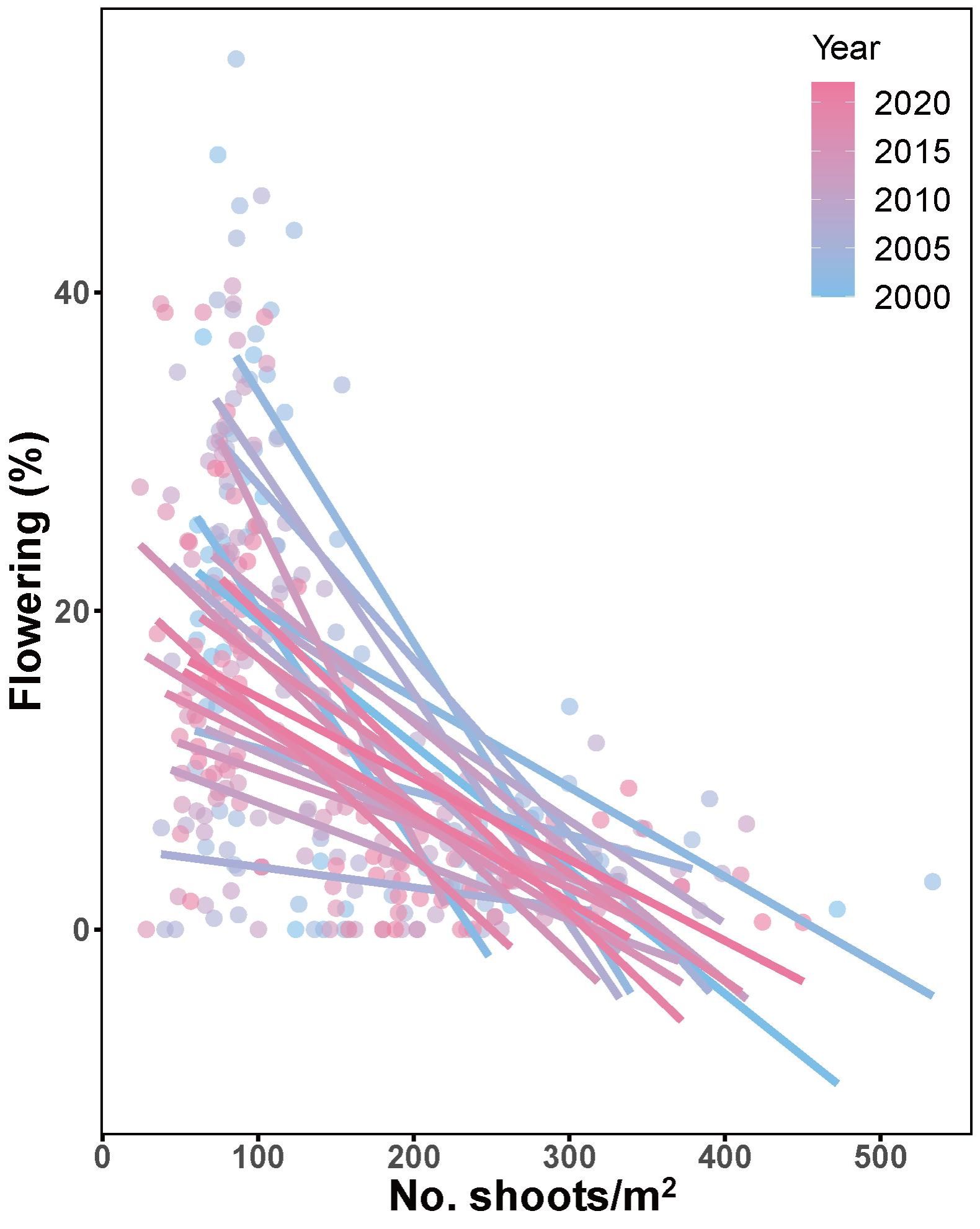 图2 2000-2022年互花米草种群开花百分比与密度之间的线性回归拟合关系。