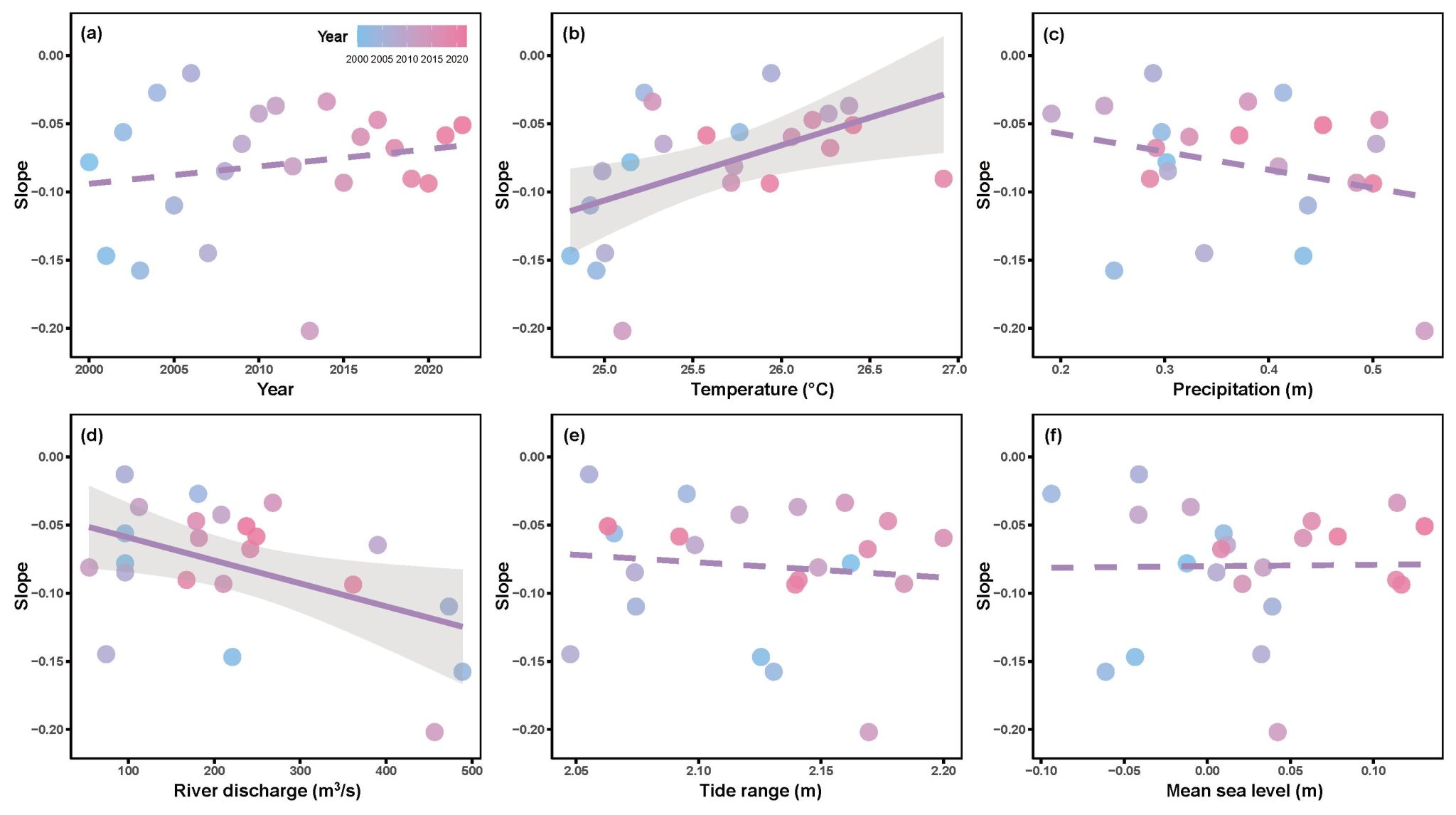 图3 互花米草有性繁殖与克隆繁殖权衡关系的年际变化(a)及环境因子对繁殖权衡的影响(b:温度;c:降水量;d:河流量;e:潮差;f:海平面)。每个点代表当年互花米草种群开花百分比与密度之间的线性回归拟合斜率。