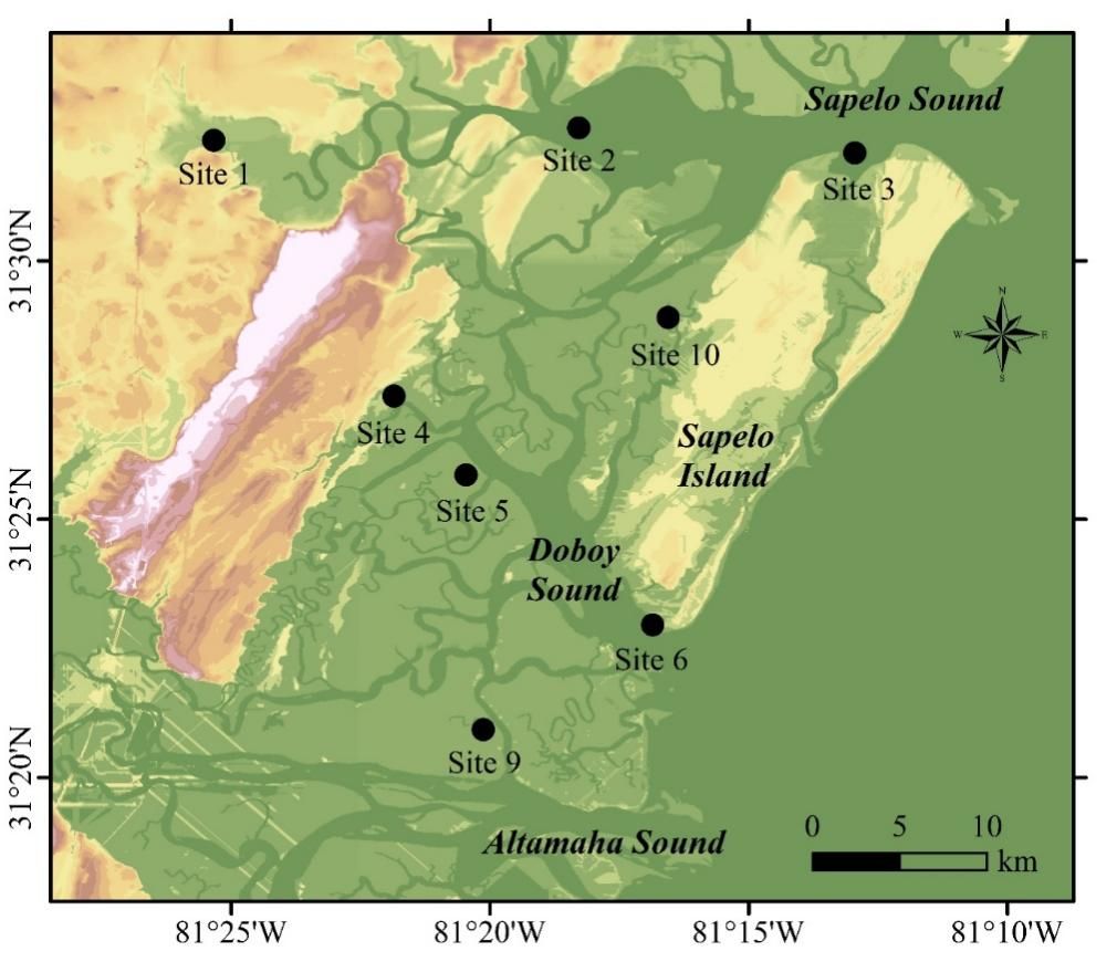 图1 美国佐治亚海岸生态系统长期定位观测站8个盐沼植物长期观测样点地理分布图。