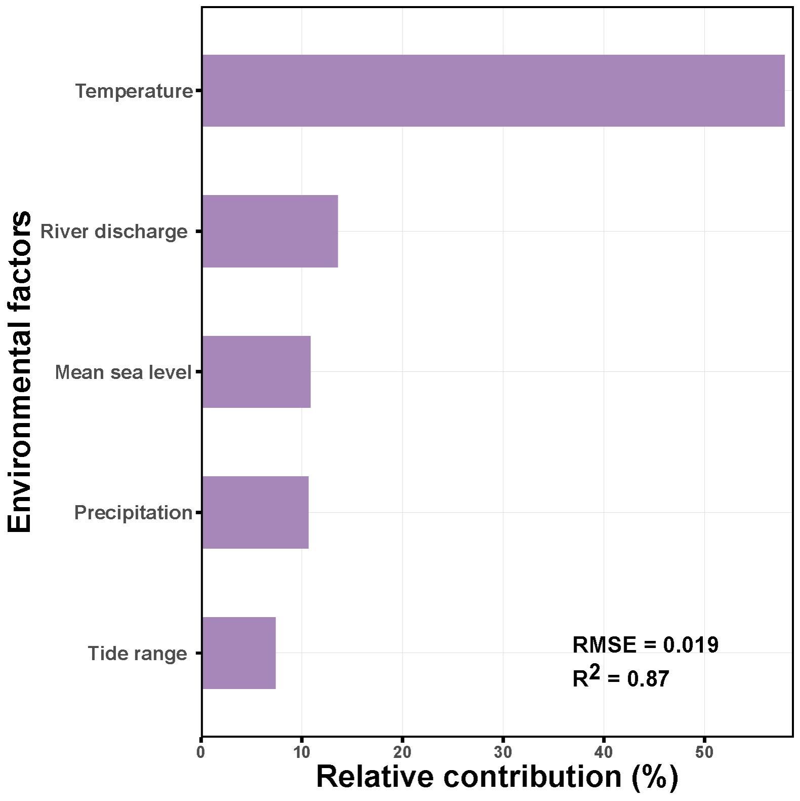图4 随机森林模型中的全球变暖相关环境因子(温度、河流量、降水、潮差和海平面)对繁殖权衡关系影响的相对贡献。