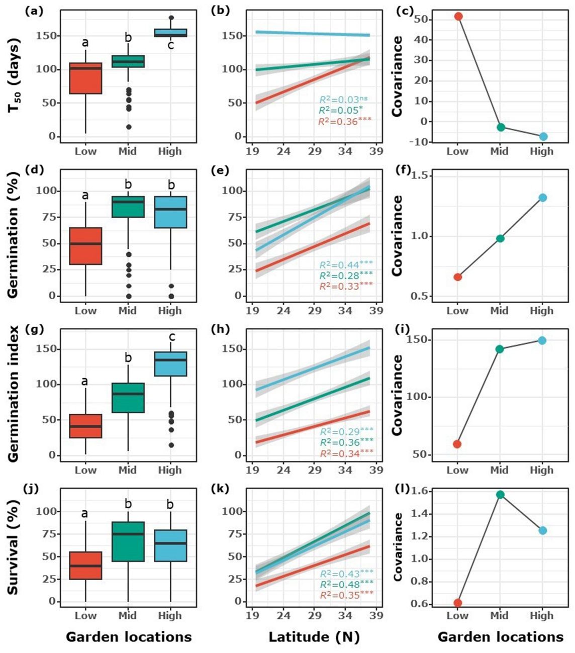 图3 跨纬度温室同种植园间互花米草平均萌发时间T50(a)、萌发率(d)、萌发指数(g)和幼苗存活率(j)的差异(不同字母表示P < 0.05;采用非参数Kruskal-Wallis检验进行多重比较);跨纬度温室同种植园中不同纬度互花米草种群种子萌发及幼苗存活特性沿纬度的变化趋势(b、e、h、k)(ns表示P > 0.05;*表示P < 0.05;**表示P < 0.01;***表示P < 0.001);跨纬度温室同种植园间自然选择系数的变化(c、f、i、l)