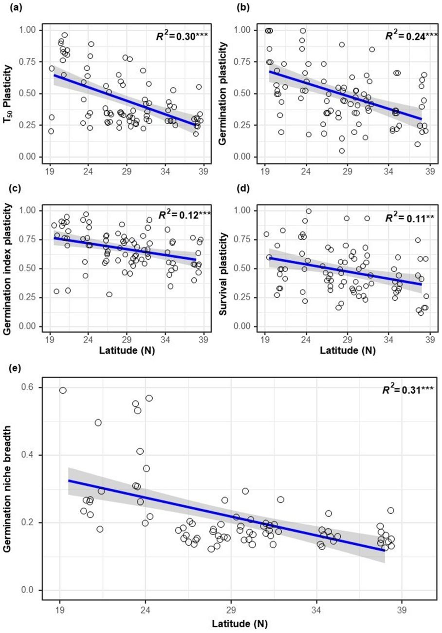 图4 互花米草种群的平均萌发时间T50可塑性(a)、萌发率可塑性(b)、萌发指数可塑性(c)、幼苗存活率可塑性(d)和萌发生态位宽度(e)沿纬度梯度的变化趋势(**表示P < 0.01;***表示P < 0.001)