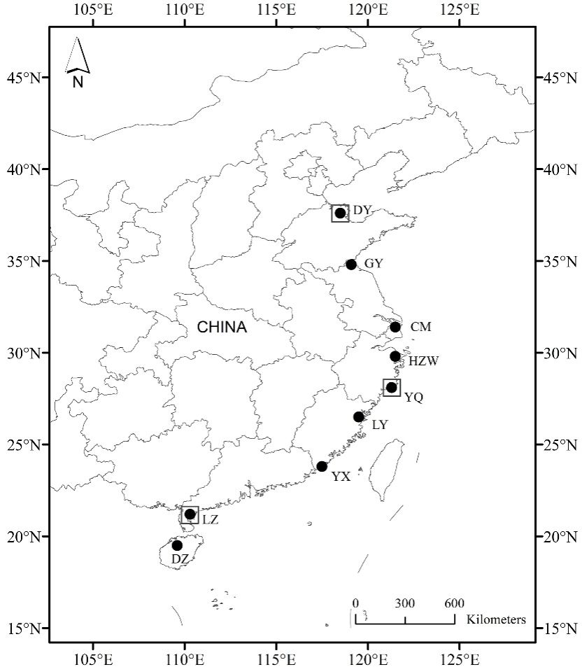 图1 野外跨纬度互花米草种子采样地点(黑色实心点)和温室同质种植园地点(正方形)