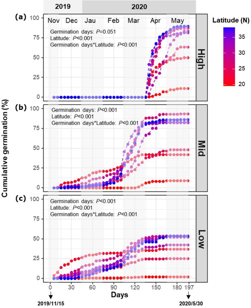 图2 跨纬度温室同质种植园中不同纬度互花米草种群种子萌发过程:高纬度同质种植园(a);中纬度温室同质种植园(b);低纬度温室同质种植园(c)