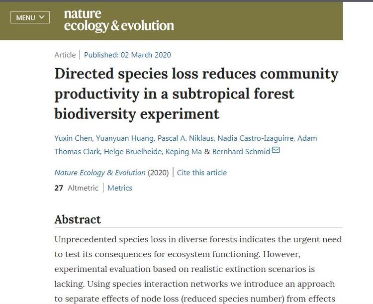 但一个中瑞德三国专家组成的跨国科研团队经过八年的研究发现:在多样性高的森林中,当物种“随机”灭绝时,其对森林产材量的影响接近于零;但是当物种是“非随机”灭绝时,其对森林产材量的影响则会很大。研究数据表明,后者情境下的森林减产量为前者的20倍。这一研究成果,被国际顶尖学术杂志《自然》旗下的子刊《自然-生态学与进化》(Nature Ecology & Evolution)于北京时间3月3日零点在线发表。