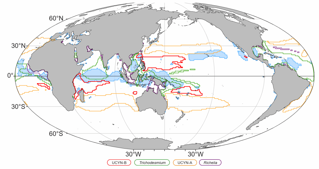 该研究基于在西北太平洋副热带流涡区开展的高分辨率观测,定量分析了固氮生物群落的丰度、结构和固氮速率,进而应用广义加性模型刻画的优势固氮蓝藻的生态位特征预测了其在全球海洋的主要分布格局,首次系统性地评估了单细胞固氮蓝藻UCYN-B的全球固氮通量,揭示了其对海洋固氮的重要贡献。该研究不仅为海洋生物固氮研究提供了翔实的关键数据,也为认知气候变化下的海洋氮循环和生产力循环的演变提供了新视角。