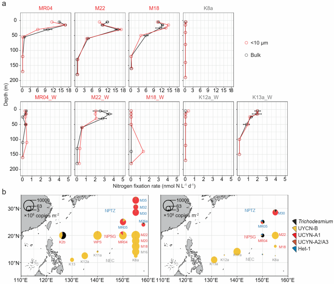 a剖面分粒径固氮速率;b真光层深度积分固氮蓝藻丰度