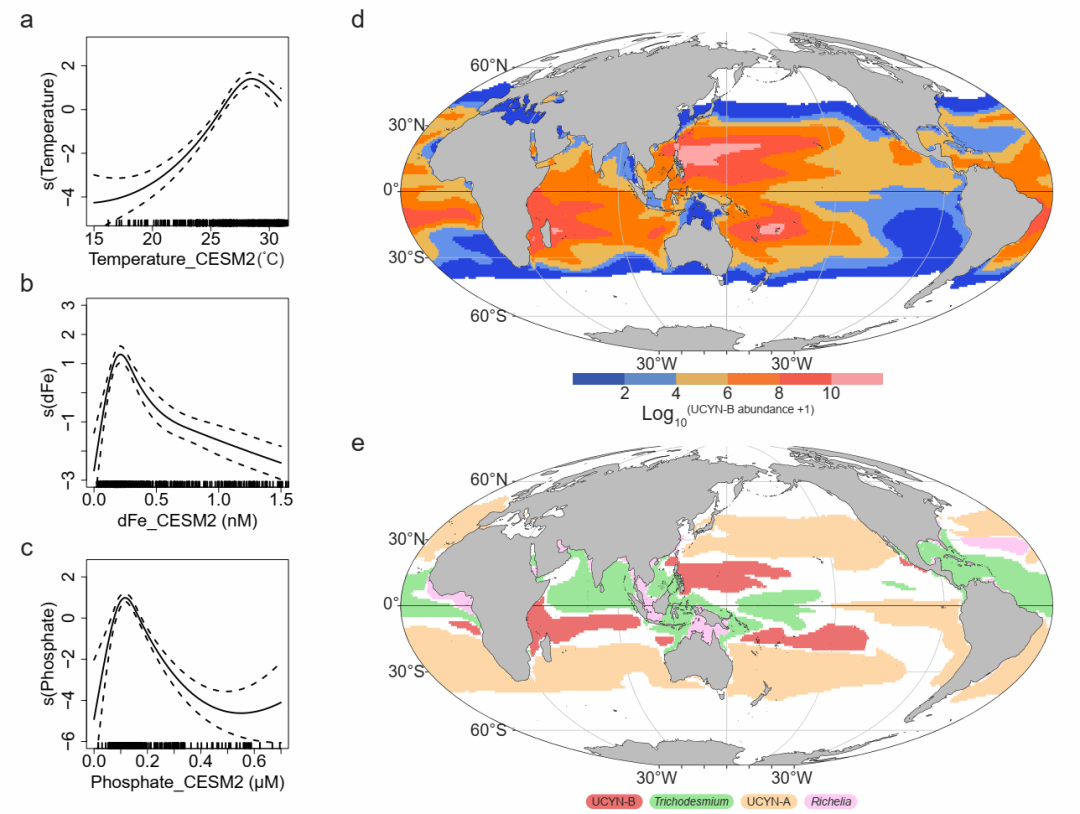 a-cUCYN-B环境因子响应曲线;d UCYN-B全球丰度模拟;e 主导固氮类群模拟