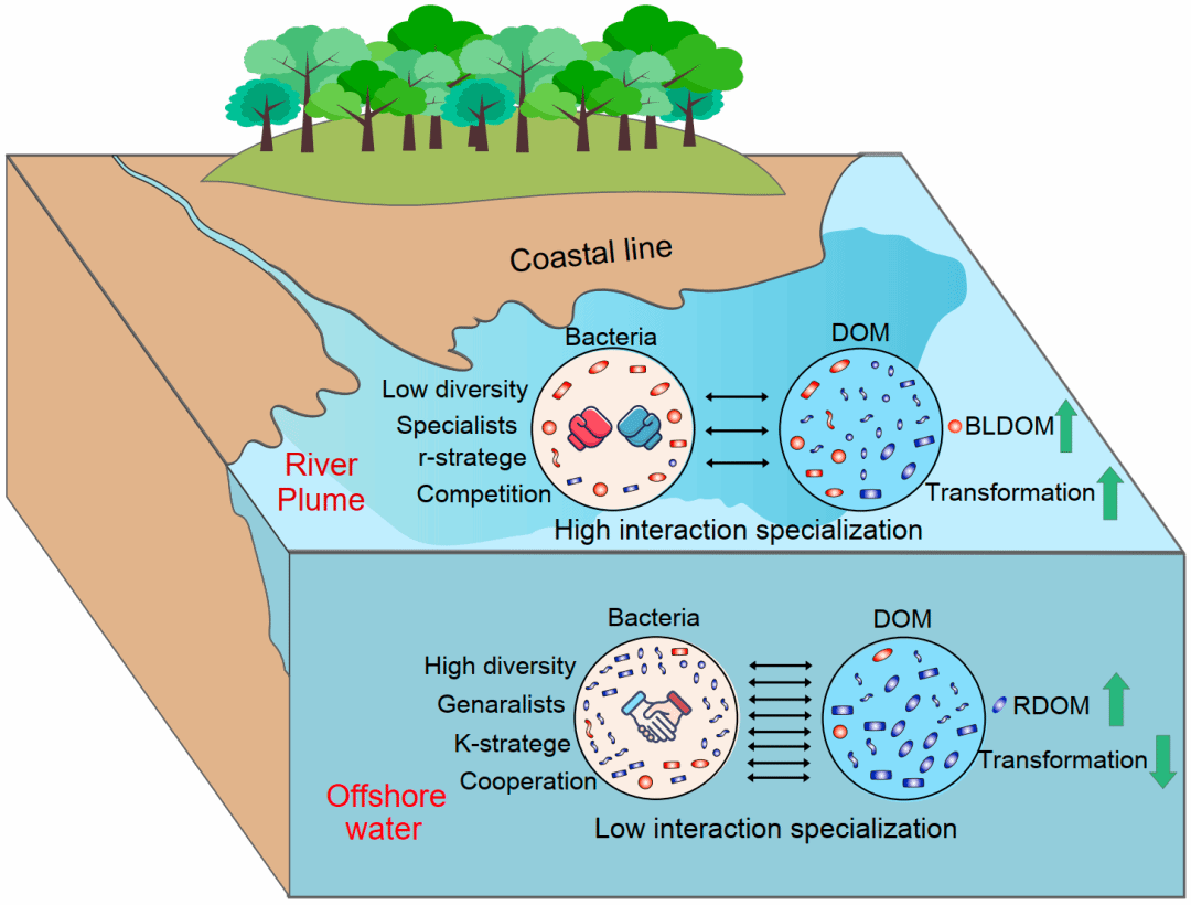 浮游细菌是海洋碳循环的重要组成部分,广泛参与有机质的降解转化与次级生产,并在调控碳流动与能量再分配中发挥核心作用。其群落结构与功能表现高度依赖外源资源供应及环境梯度变化,体现出显著的生态适应策略。作为典型的陆海交汇系统,河口羽流输入了大量成分多样的DOM,不仅改变了近岸海域的碳来源与可利用性,也深刻影响着浮游细菌的性状构成、谱系结构与代谢功能,并进一步影响整个浮游生态系统的结构和功能。厘清DOM组成变化如何驱动细菌群落重构与功能响应,是揭示微生物调控下碳转化与储存机制、评估生态系统稳定性与响应潜力的关键科学命题。