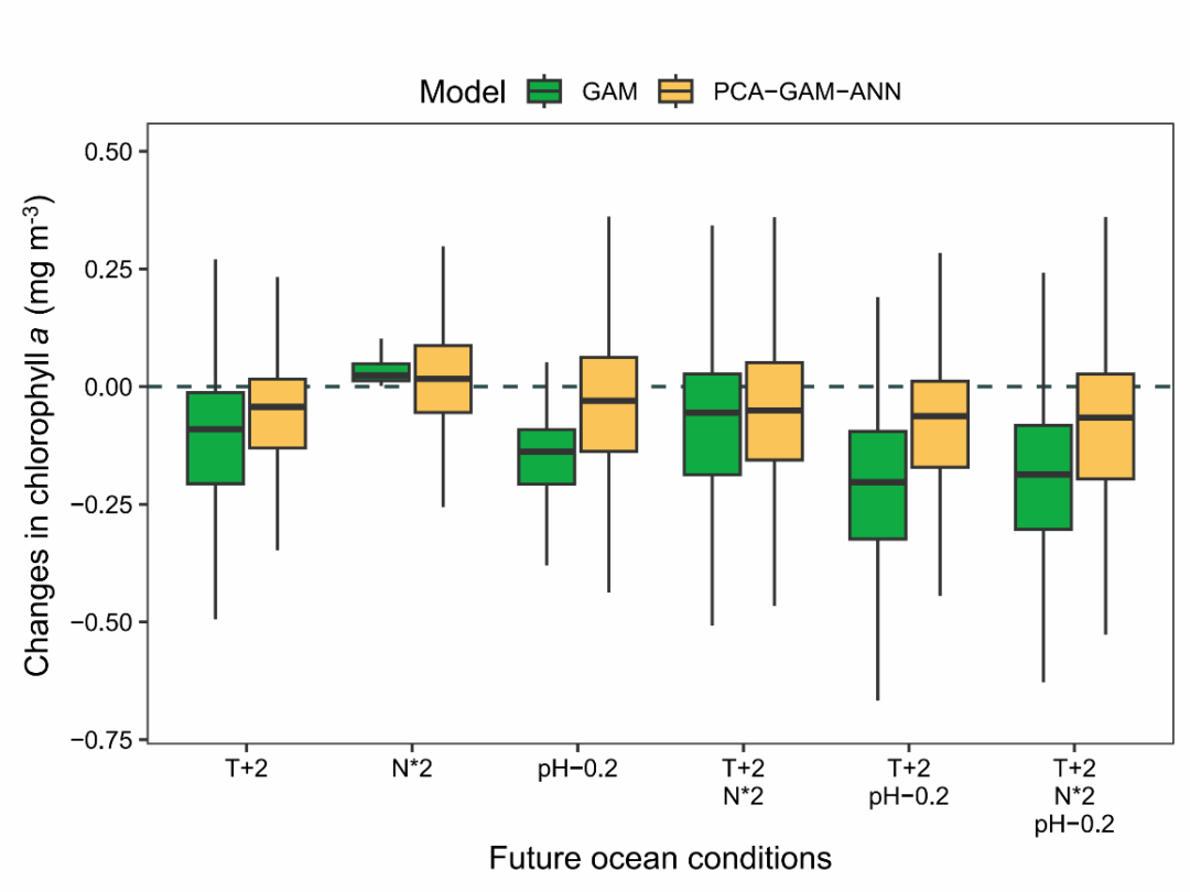 基于PGA模型,团队进一步模拟了未来升温(温度升高2℃)、酸化(pH下降0.2)与富营养化(营养盐翻倍)三种典型胁迫的单独及联合情景下浮游植物的响应路径。结果显示,尽管富营养化可引发2.8%的叶绿素升高,但在升温和酸化的背景下,其增益效应明显受限;三种胁迫联用时,生物量总体下降达18.3%。该结果不仅反映出浮游植物对多重环境胁迫的脆弱性,也表明在营养盐并非强限制因子的区域,营养盐的进一步增加难以缓解气候变化带来的生态风险。