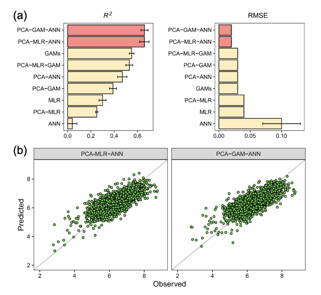 为此,研究团队创新性提出“模型串联”思路(图1b),将主成分分析(PCA)、广义加性模型(GAM)与人工神经网络(ANN)依次连接,构建出PCA-GAM-ANN顺序建模框架,并命名为PGA模型。就像电流在串联电路中需连续通过多个电阻,PGA模型可逐层激活每种方法的优势:PCA降维以消除多重共线性,GAM拟合非线性生态响应,ANN进一步拟合残差并学习高阶交互结构,形成逻辑紧密的建模流程。