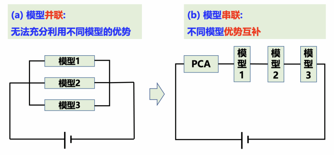 此外,以往研究多采用“模型并联”的策略(图1a),即并行构建多种模型并选取其中预测效果最好的结果,类似于电路中的“并联系统”——电流最终只从阻抗最小的路径通过,其余路径虽在却无实质作用。同样,并联建模看似集成,实则仅利用了单一模型的能力,未能充分融合各模型的优点。