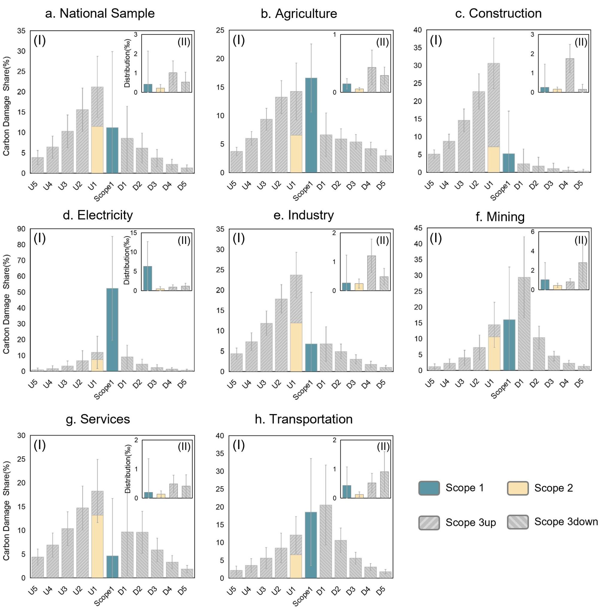 基于对上市公司碳足迹的全面核算,本研究进一步引入社会碳成本(Social Cost of Carbon,SCC),将企业活动各环节的碳排放量转化为相应的经济损失,从而衡量企业行为对社会造成的负外部性。研究结果表明,中国上市公司的碳损失主要源于价值链排放,其中一级供应商为关键贡献源,平均占总碳损失的21.58%。不同行业之间呈现显著差异,电力企业碳损失最高,且以直接排放为主,采矿企业的碳损失则以下游用户贡献最为突出,而工业、建筑和服务业则普遍表现为间接排放驱动。