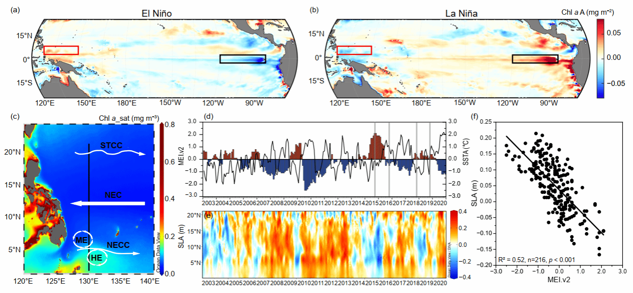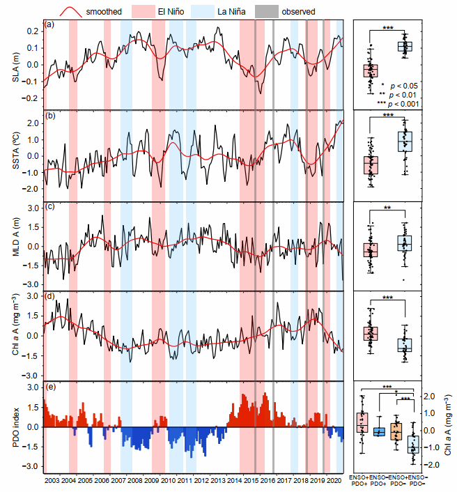 厄尔尼诺-南方涛动 (ENSO) 事件和太平洋年代际振荡 (PDO) 是对海洋生态系统产生重要影响的气候现象,这些现象在气候系统中呈现周期性变化。通常情况下,厄尔尼诺 (El Niño) 事件会导致赤道太平洋海面温度升高,海水分层加剧以及营养盐跃层加深,从而导致叶绿素a浓度的负异常。然而,热带西太平洋在El Niño事件期间表现出海温和海平面高度负异常,这一特征使其形成了与热带东太平洋明显不同的独特水动力环境。同时,PDO在调节这些环境要素方面也发挥了重要作用,当El Niño与PDO正相位叠加或拉尼娜 (La Niña) 与PDO负相位叠加时,可能导致海洋生态系统中更复杂的响应。